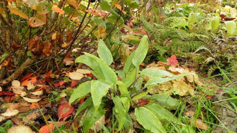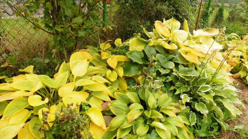Spalone liście host czy uszkodzone grzybem, w trakcie sezonu wycinałam. Teraz już za dużo tego. Nie próbuje nadążyć. Częściej patrzę na paprocie i żurawki czy dalie, niż na hosty :-D Omijam je też aparatem