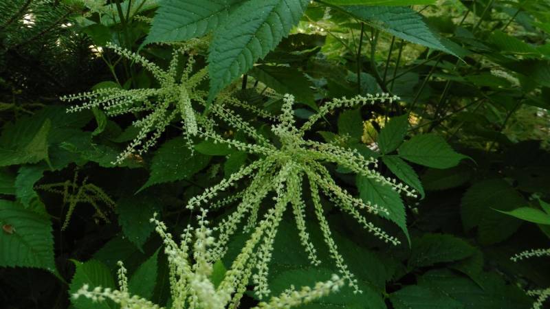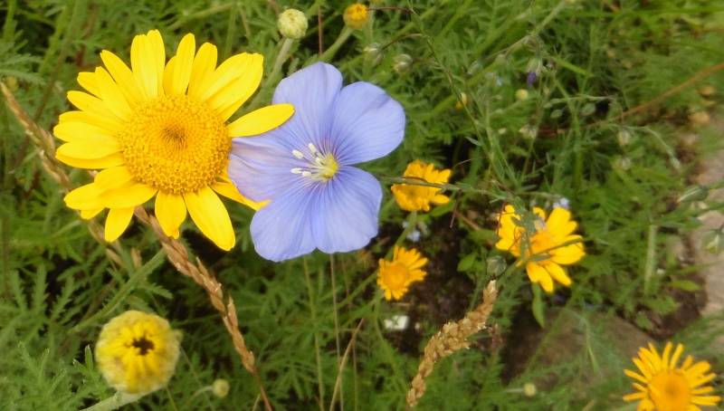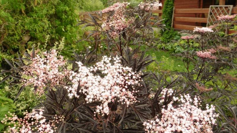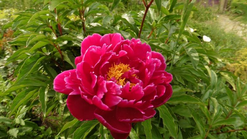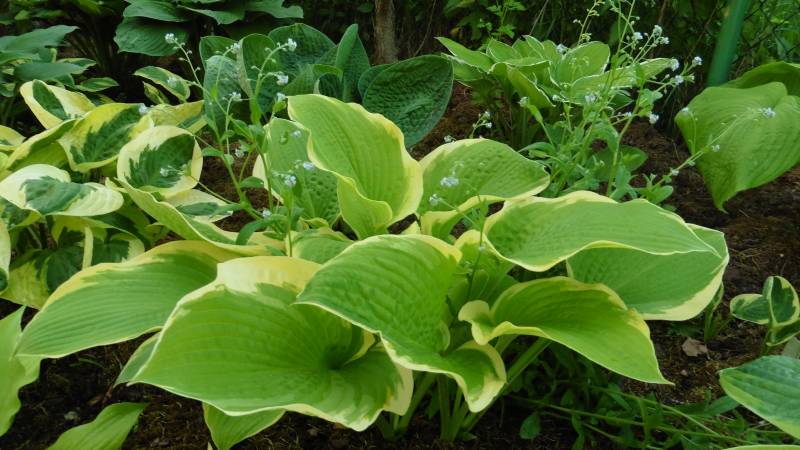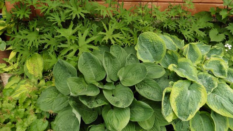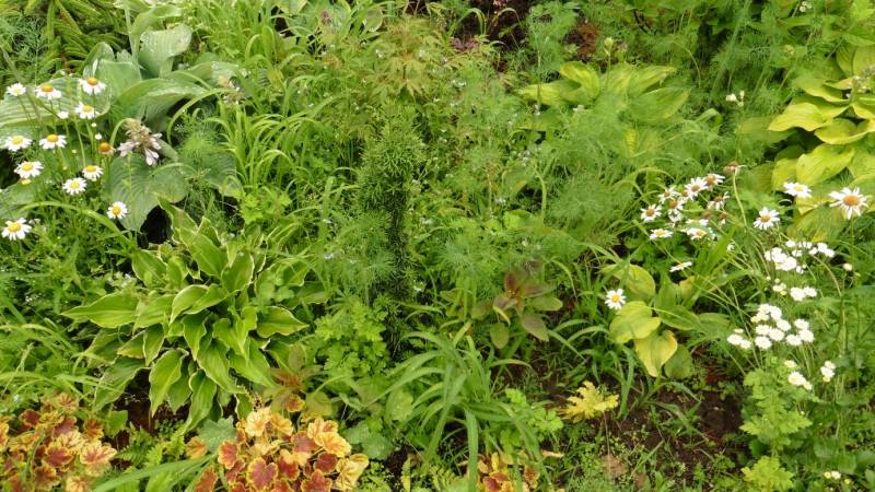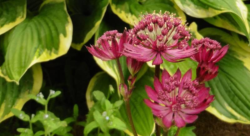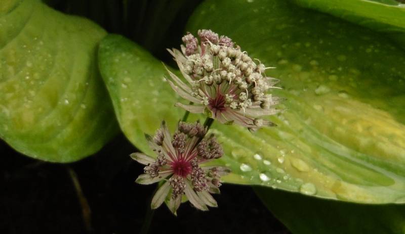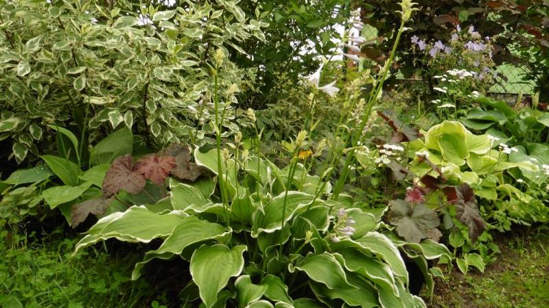 Teraz tylko od czasu do czasu go przestawiam. Ogród jest więc zielony, skutków suszy nie widać. Hosty są wielkie, pierwsze dalie kwitną