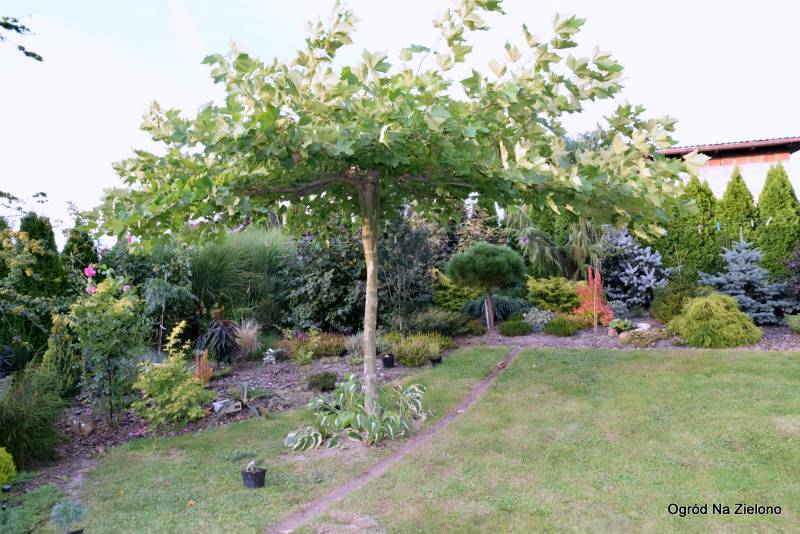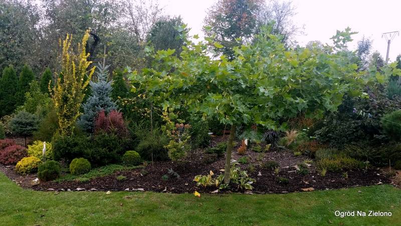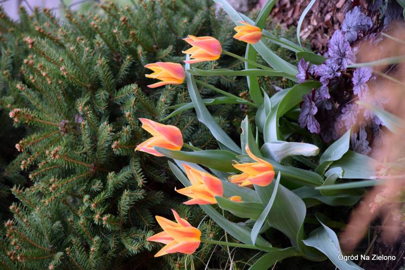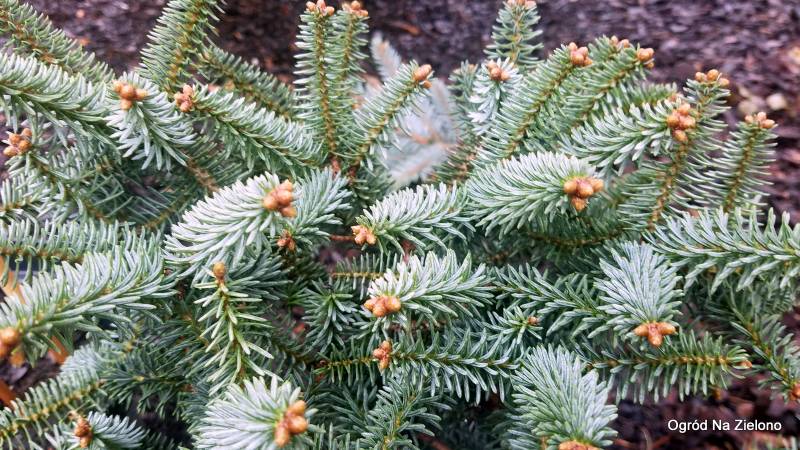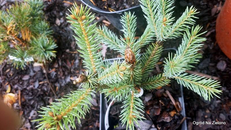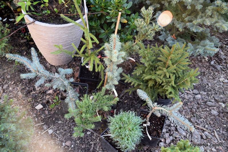 wśród nich świerk kaukaski Wittbold Compact, odmiana wyróżniająca się biało kremowym przyrostem wiosennym.