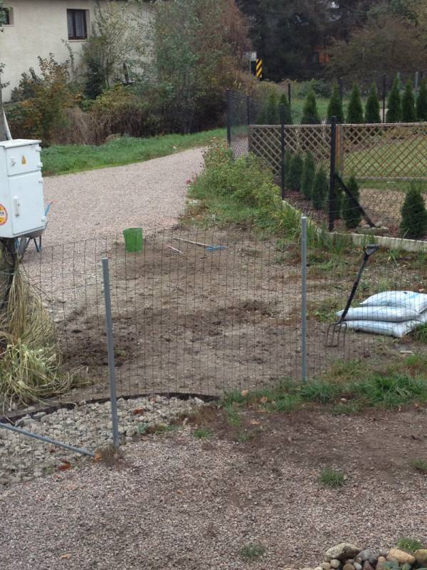 Reszta prac uzależniona jest od tego kiedy skończone zostaną umocnienia naszego kanaliku. No i od zakresu wykonanych prac. Jak kupowaliśmy działkę był w gminie plan by ciek poprowadzić w rurze i zakopać. Zbiera on wody opadowe z całej okolicy i może zalewać niżej położone działki. Plan jednak upadł bo zabrakło na to środków i będą tylko umacniane brzegi. Na początku byłam rozczarowana, gdyby został zakopany, łatwiej byłoby zagospodarować tą część działki. Zmieniłam jednak do niego nastawienie latem, wieczorny rechot setek żab rekompensuje wszystkie niedogodności. Gdyby tylko na przeciwległym brzegu sąsiad nie miał takiej graciarni, ciek mógłby być atutem nie minusem naszej działki.