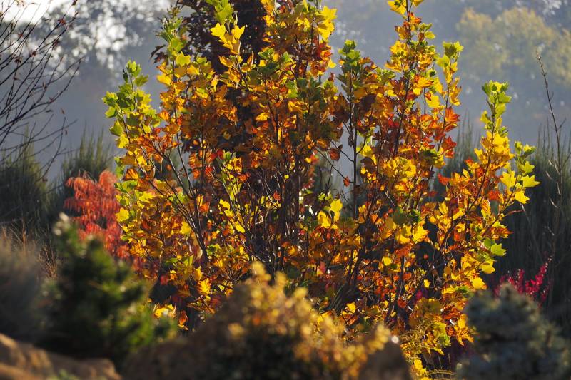 Jest to jednak docelowo ogromne drzewo więc tym razem wybór padł na odmianę karłową. Niby też kwitnie ale na razie kwiatów się nie doczekałem, za to liście dały w tym roku prawdziwy spektakl.