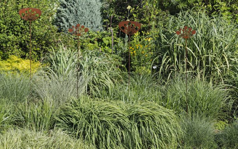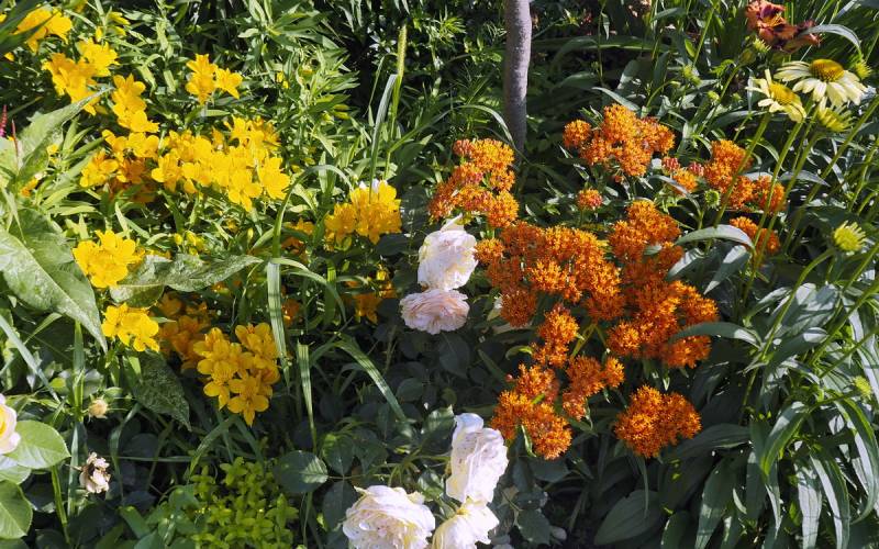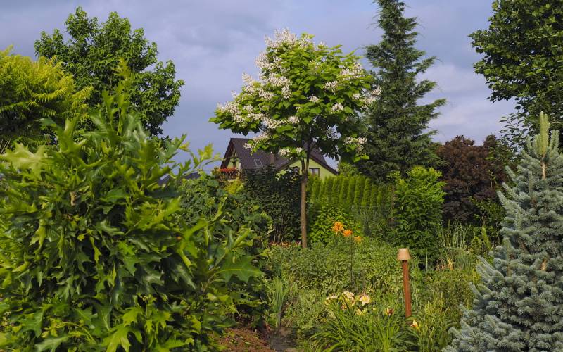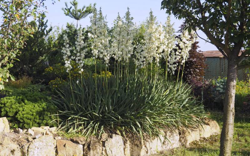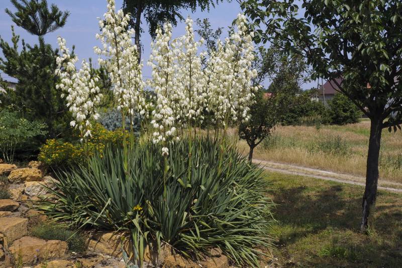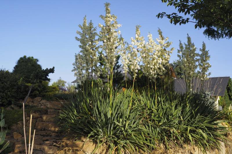 W tej suszy świetnie odnajdują się juki ogrodowe, które kwitną jak nigdy