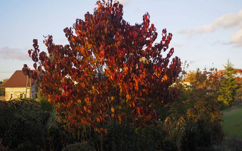Edyto jeśli chodzi Ci o efekt wiosenno-jesienny to chyba najlepszym rozwiązaniem byłyby derenie kwieciste 'Rainbow' lub 'Sunset'. One kwitną wczesną wiosną w stanie bezlistnym i naprawdę dają efekt wow.