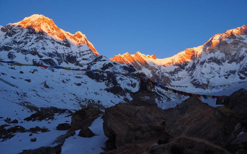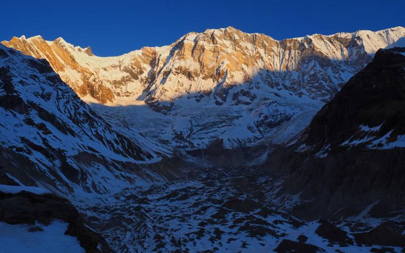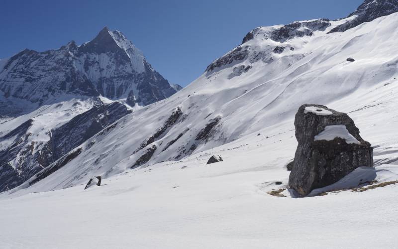 Baza jest położona w środku gniazda Annapurny i otoczona ze wszystkich stron szczytami po 7 i 8 tyś. metrów. Widok jest naprawdę nieziemski, a będąc na miejscu trudno ogarnąć,