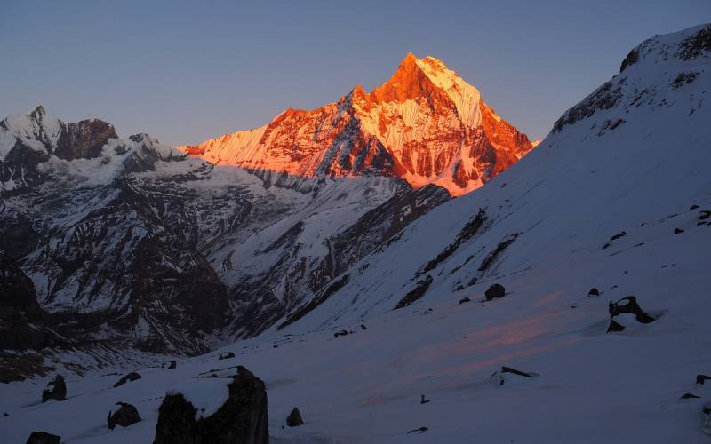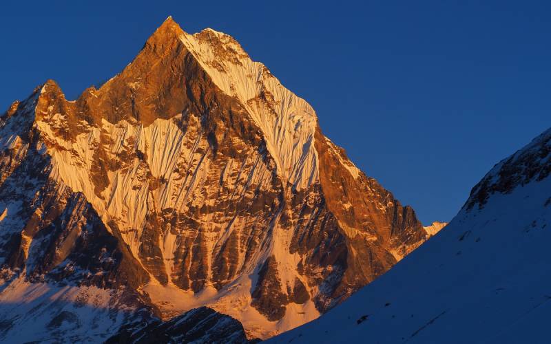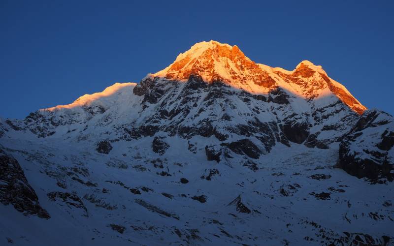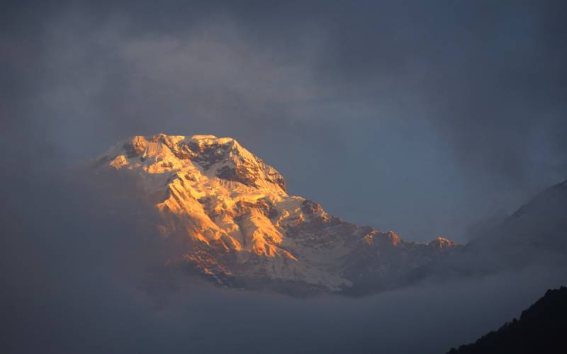 że główna Annapurna wypiętrza się jeszcze na 4 kilometry wzwyż od miejsca, w którym stoimy. Szczyt wydaje się bowiem dość płaski i na wyciągnięcie ręki, niemalże do osiągnięcia w kilka godzin.