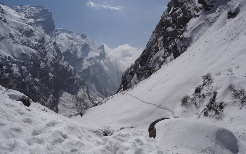 Szlaki w Himalajach stały się w ostatnich latach bardzo popularne i w sezonie jest na nich spory tłok. My jednak spotykaliśmy co najwyżej kilku turystów dziennie, a w bazie pod Annapurną