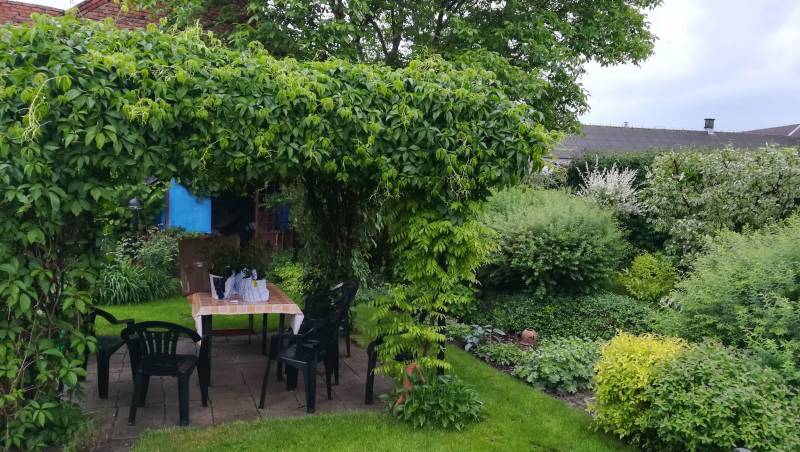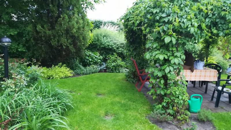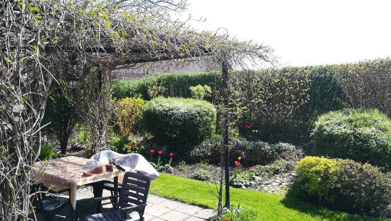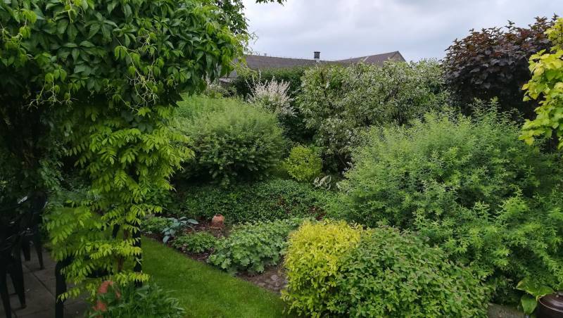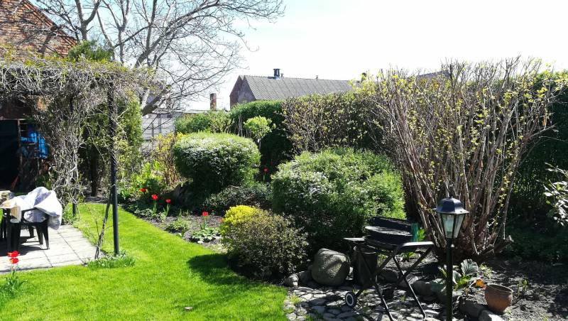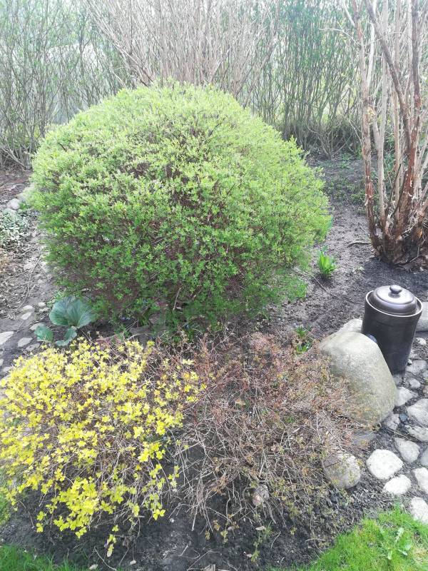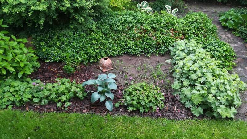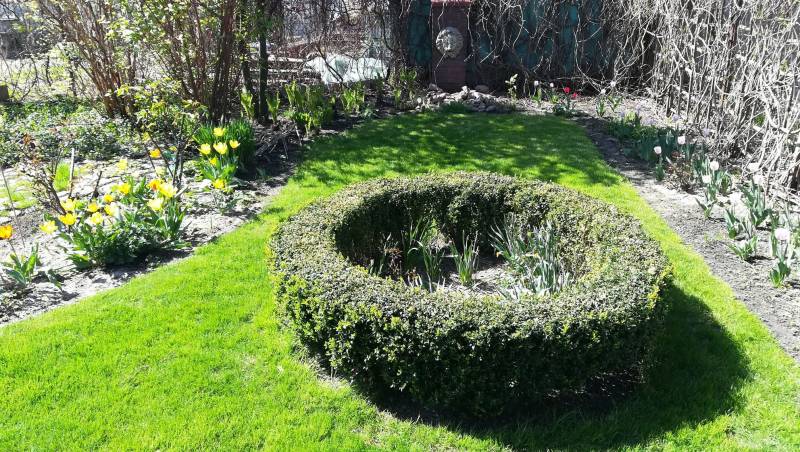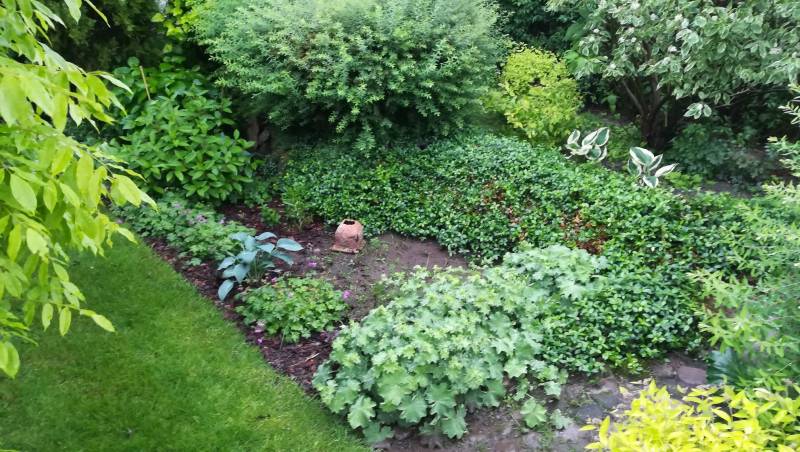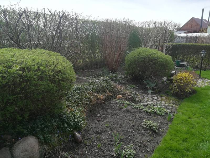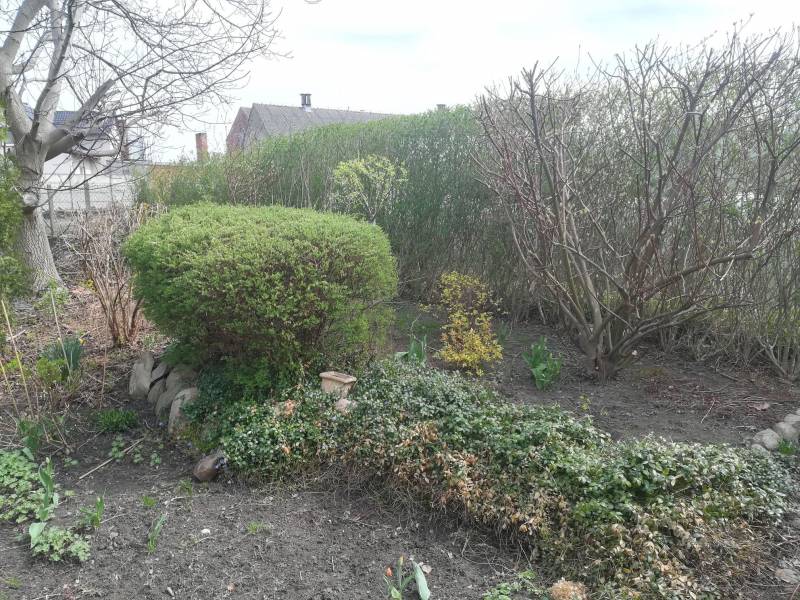 Chyba przymrozek podniszczył mi barwinka. Ni nic, odrośnie. Generalnie jeszcze ubogo. Zasadnicza zmiana przychodzi wraz z rozwinięciem się liści winobluszczu.