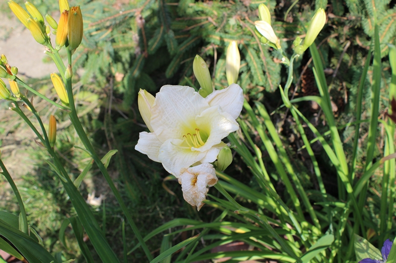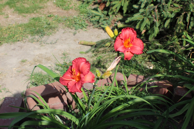 Wszystko powolutku zaczynało nabierać kształtu i koloru, ale sytuacja zmusiła do powrotu do rodzinnego miasteczka. Tu na dużej działce z malutkim domkiem rosły brzozy, świerki , orzechy włoskie i kawałek olbrzymiego żywopłotu z bukszpana. Wycięliśmy tylko jednego orzecha, reszta została. Problemem była ziemia, piaszczysta i kwaśna, dodatkowo nieogrodzona i 50 metrów od lasu, z którego podczas ulewnych deszczy, szorowały potoki kwaśnego piachu. Najpierw zaczęłam od wrzosowiska pod świerkiem, nawiozłam torfu z łąki. Zimą przyszła fala suchego mrozu i wszystko szlak trafił. Pod brzozami nie dało się nic wsadzić, bo masa splątanych korzeni nie pozwoliła nawet wbić szpadla. Z poprzedniego miejsca przywiozłam kilka roślin, niestety przeżyła tylko tawuła (chyba szara), która dziś ma ponad 2 metry i mahonia. Kupowałam i sadziłam przypadkowo rośliny. Nic nie chciało rosnąć, albo ja nie miałam czasu i zdychało.