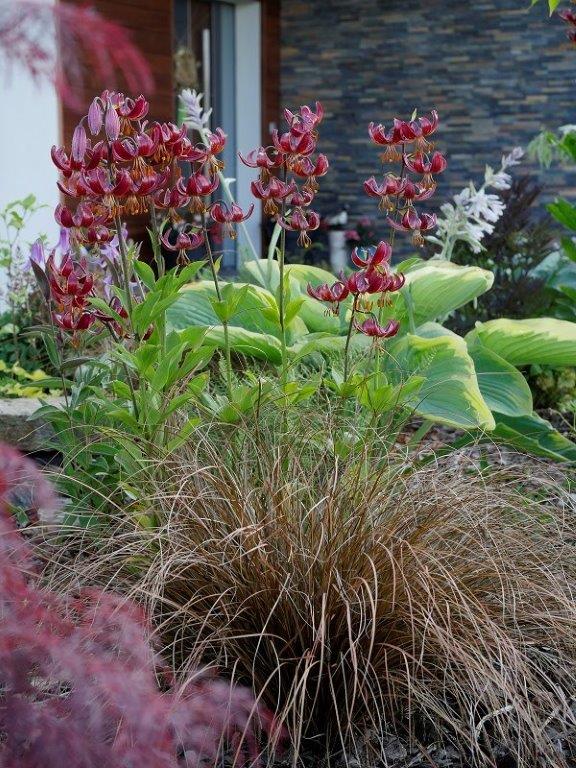 Dla Ciebie kępa martagonów Cloud Shride z przodu domu i w tle Hosta Wu La La