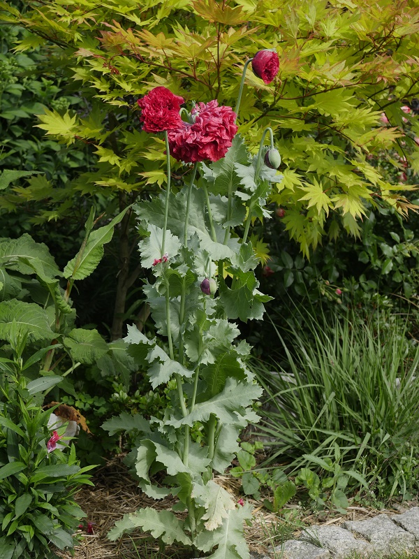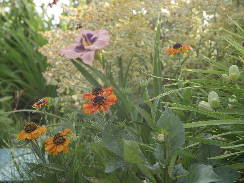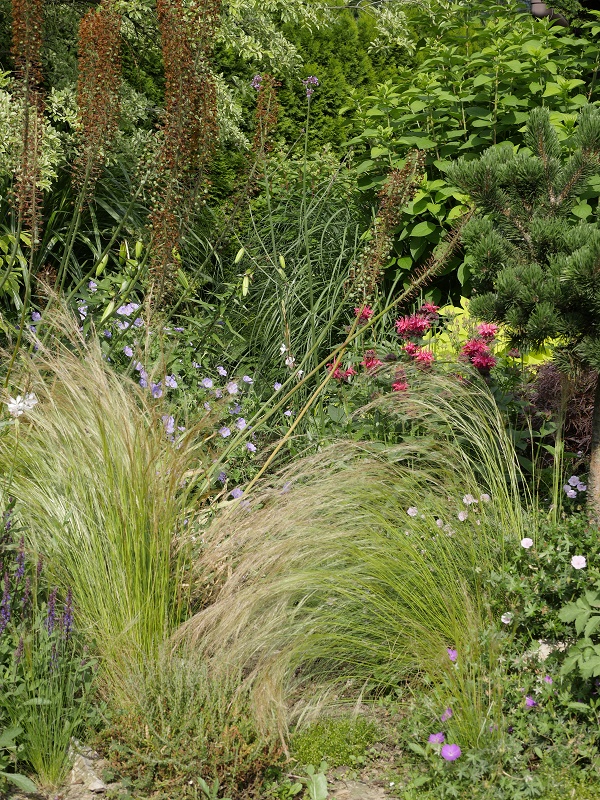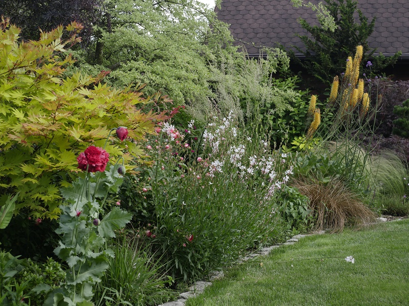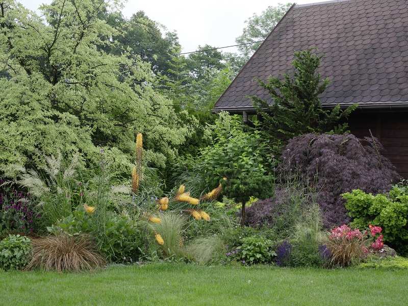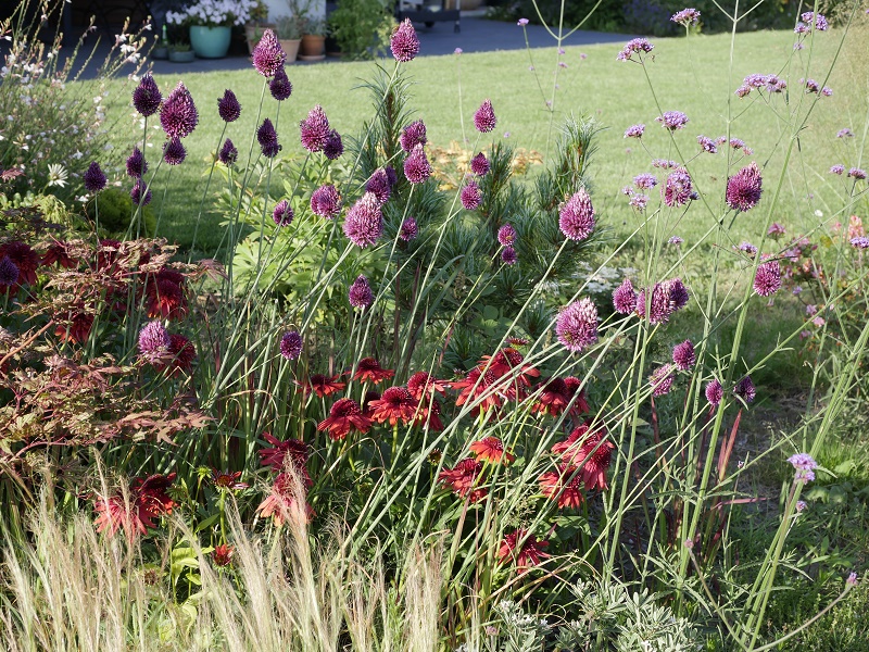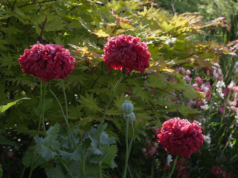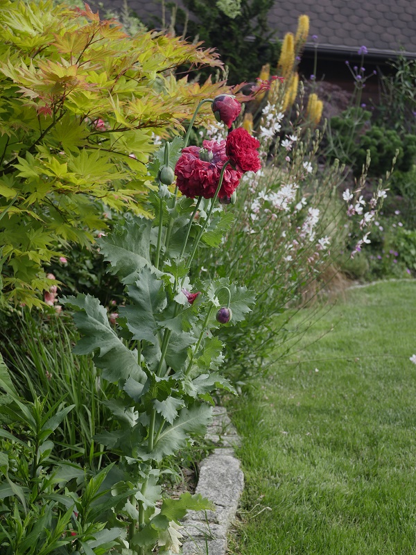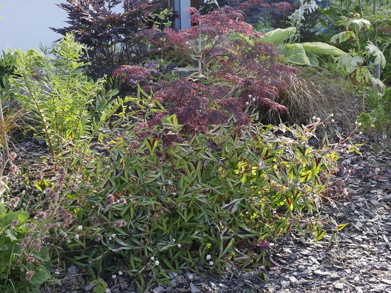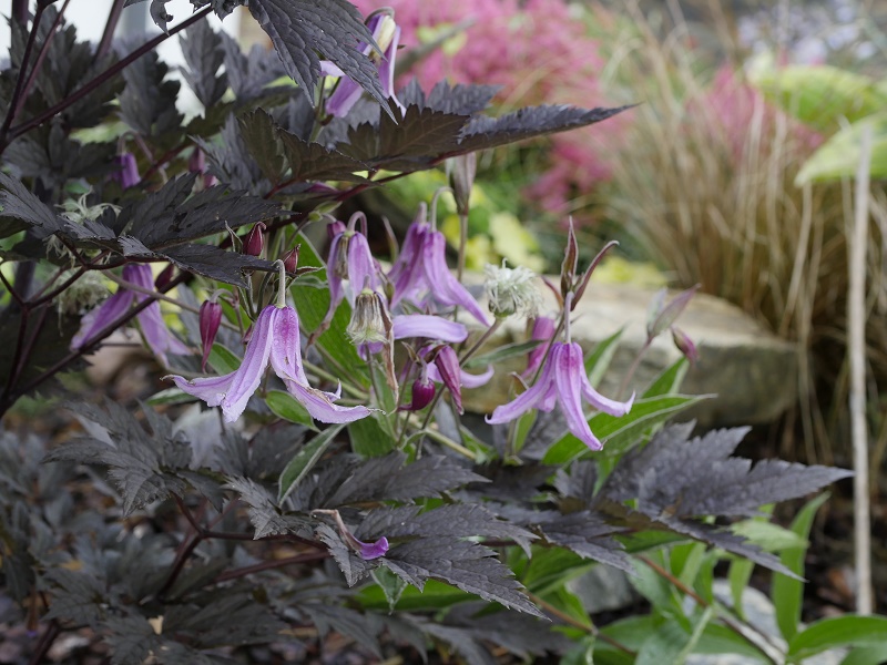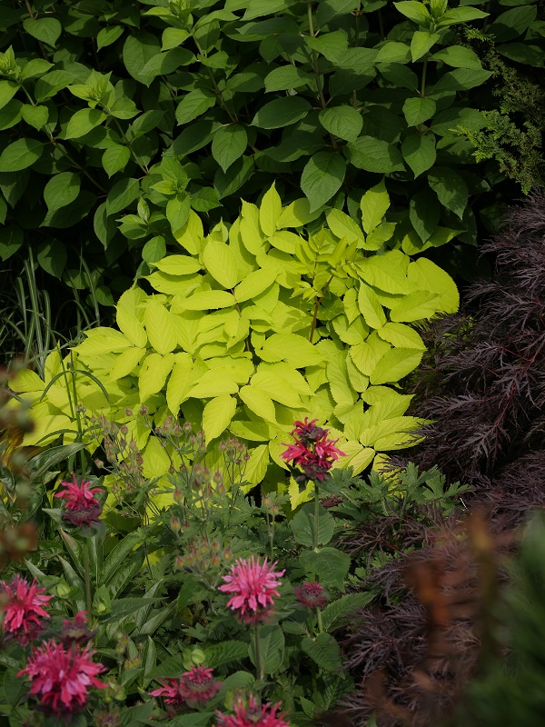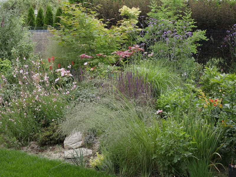 Klon Red Feathers lekko zarósł rdestem - nie zdawałam sobie sprawy, że z niego taki potwór, ale kolorystycznie ładnie do siebie pasują...