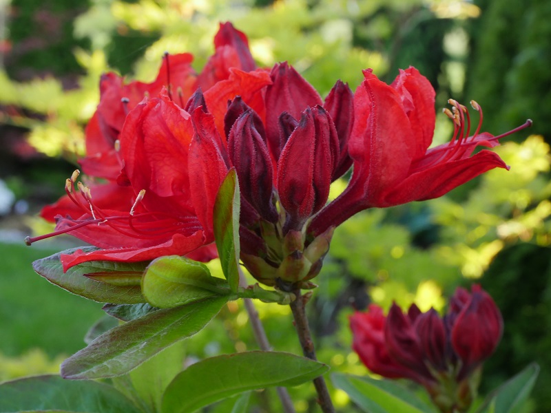 Czerwona azalia rośnie na podobnej wystawie i w równie trudnych warunkach bo zaraz przy thujach, co pomarańczowa ale ma zdecydowanie mniej kwiatów, u mnie 4-5 lat, wysokość około 1m, kwitnie później niż pomarańczowa, delikatnie pachnie