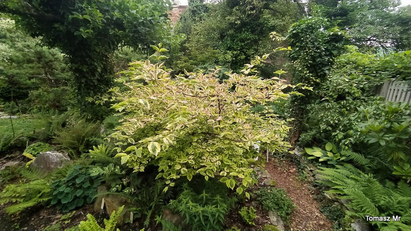 Dereń 'Tricolor', powoli 'łapie' różowo-czerwoną barwę.