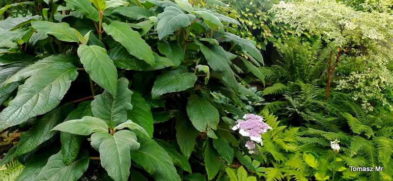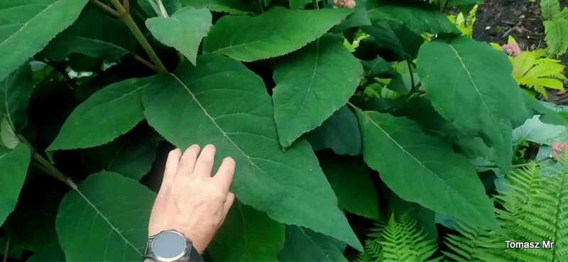 Hortensja kosmata została jesienią mocno przycięta ..więc kwiatów ma niewiele, ale liście są olbrzymie