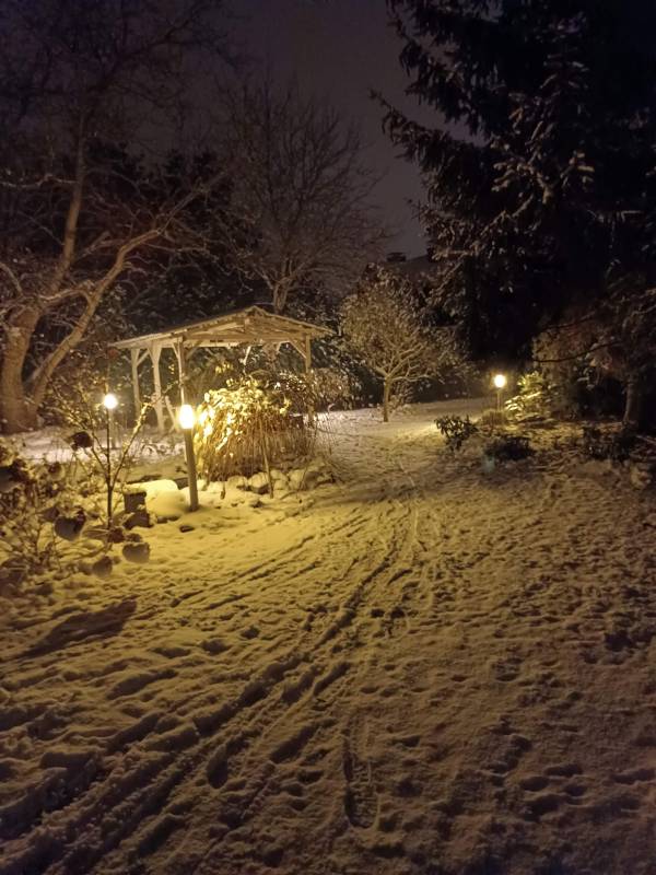 Niesamowity widok zaśnieżonego ogrodu, po prostu pięknie i tak... bezpiecznie. Wiem, że warunki drogowe zapewne do kitu, ale ogród masz zabezpieczony.