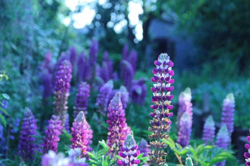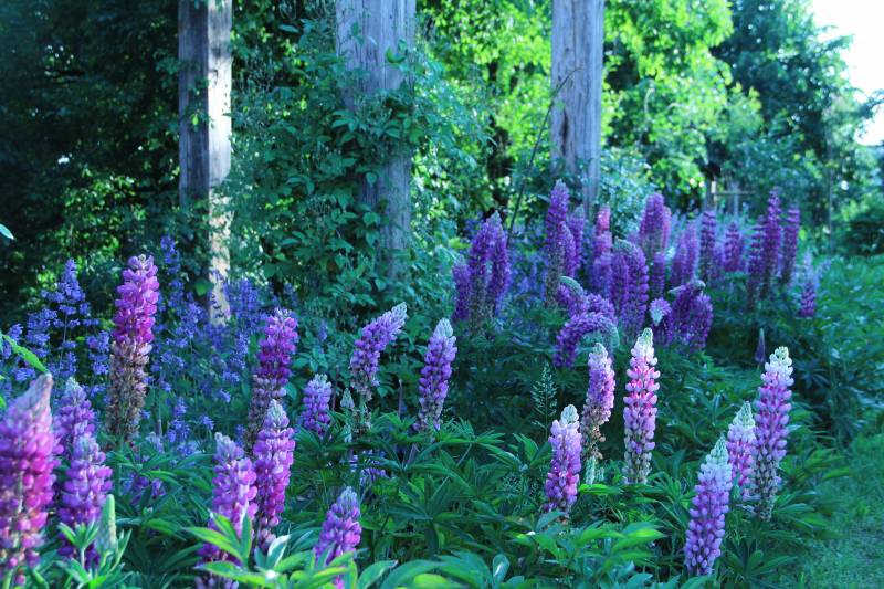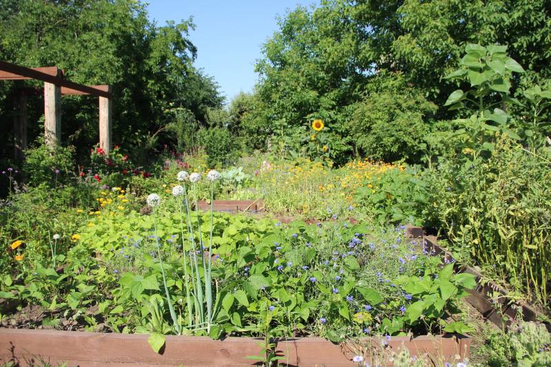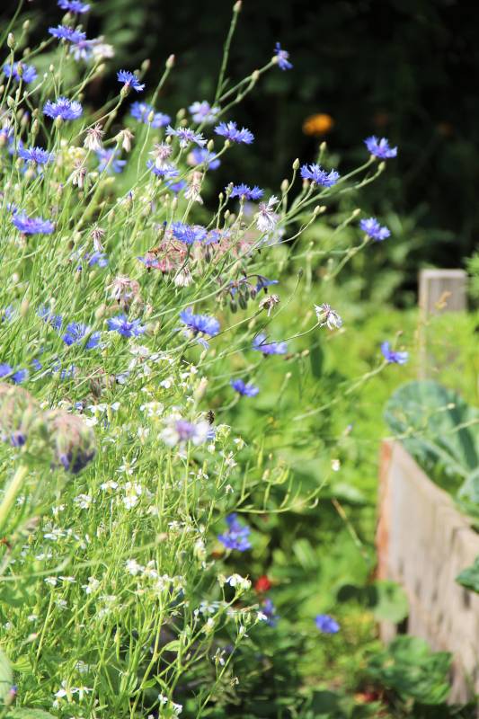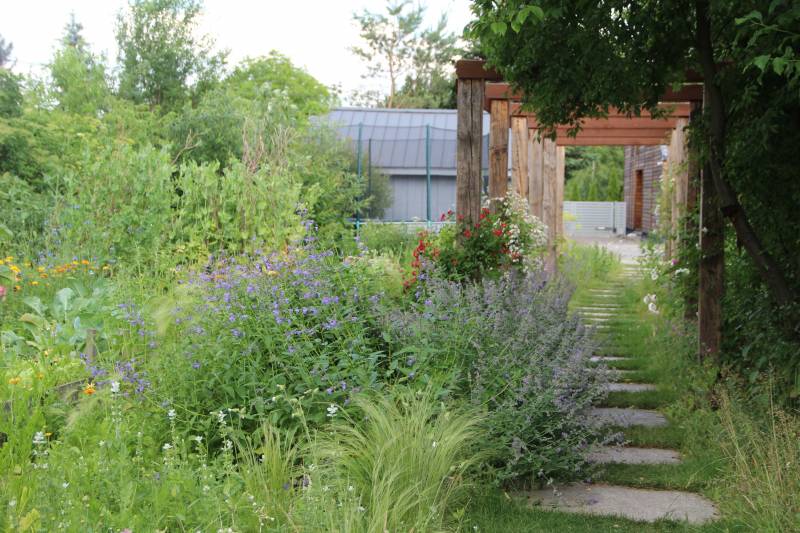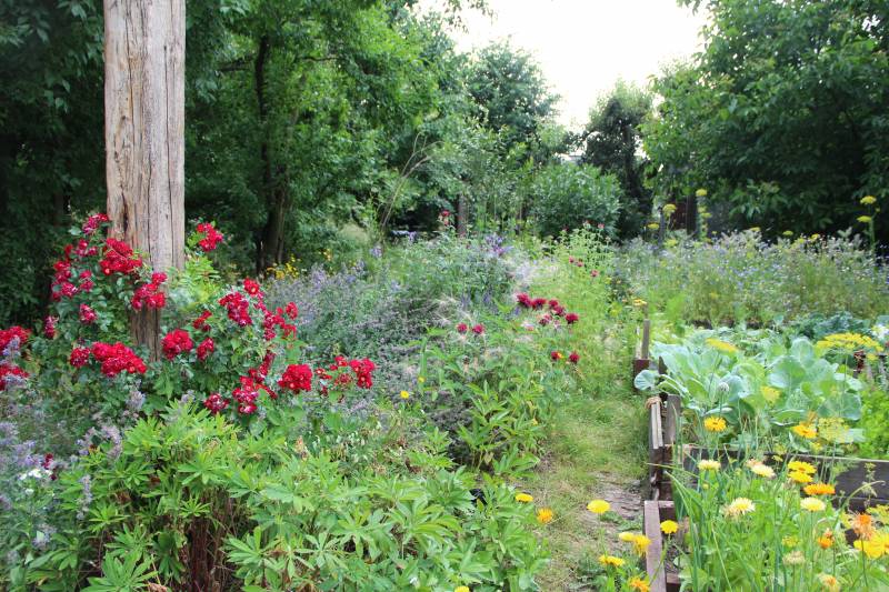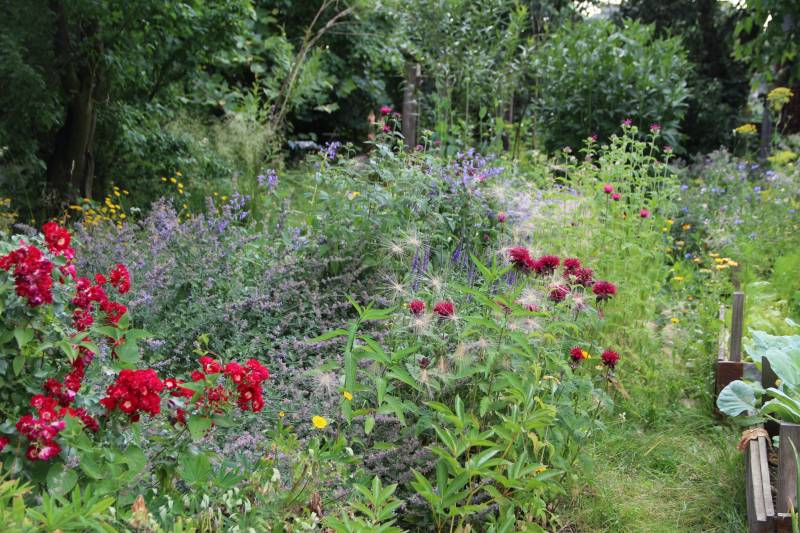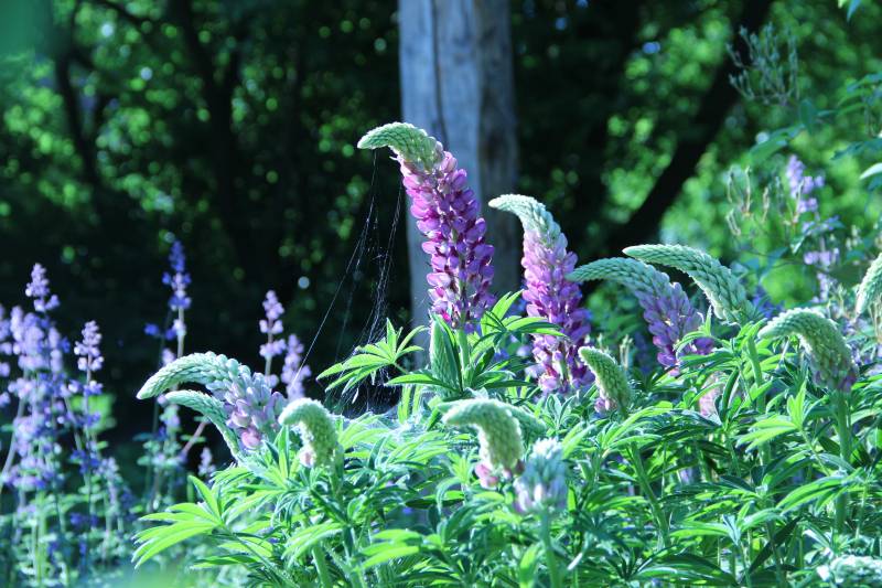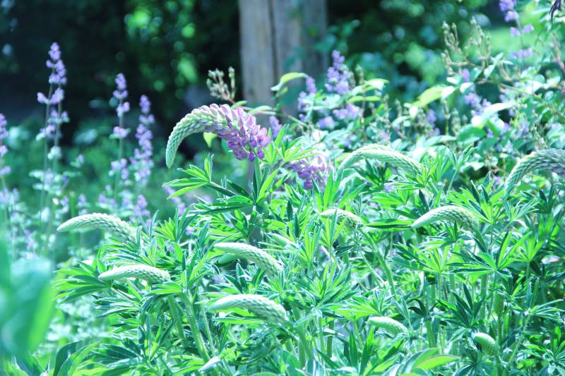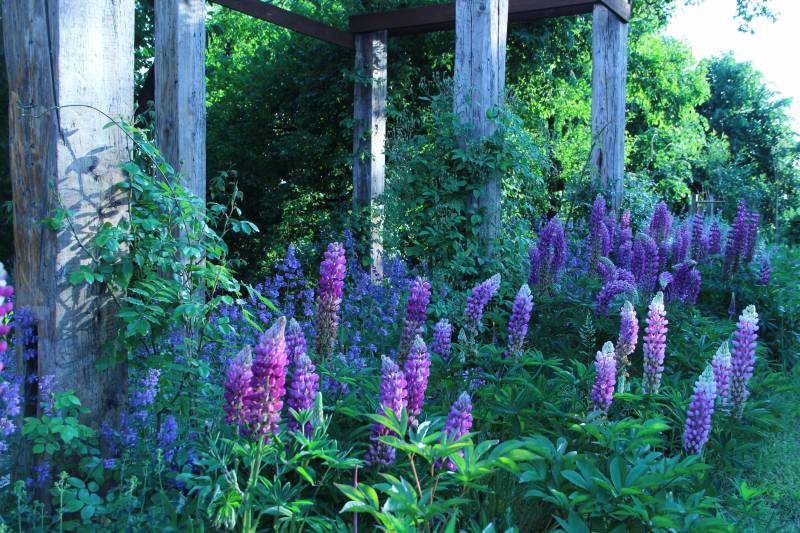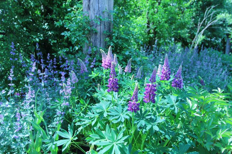 między pergolą a skrzyniami na warzywa jest szeroki na ponad metr pas z kwiatami. powstawał wiosną ubiegłego roku. kocimiętki rozmnożyłam z podziału jednej kępy. łubiny wysiałam. okazuje się, że wszystkie są w odcieniach fioletu. piwonie dostalam, ale nie kwitły w tym roku, więc nadal skrywają swą tajemnicę