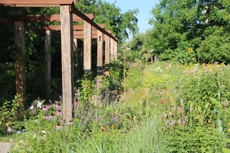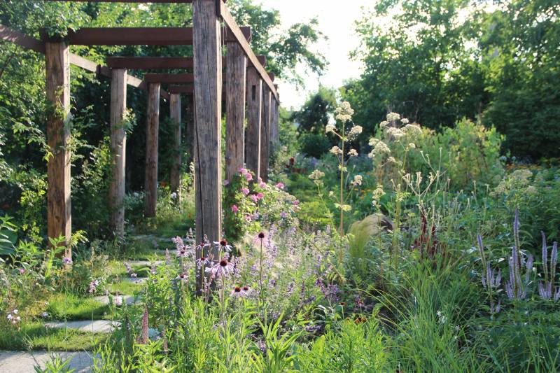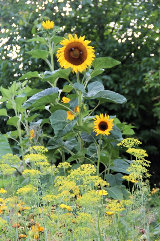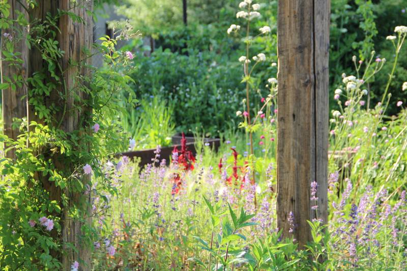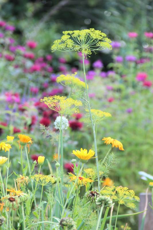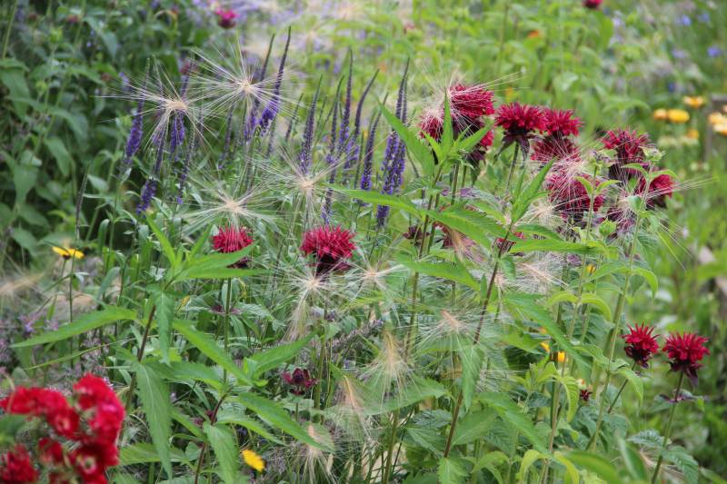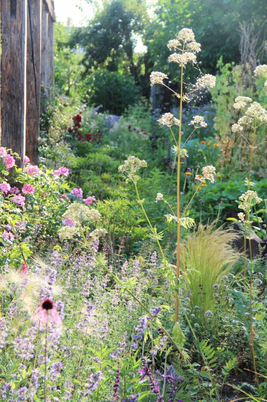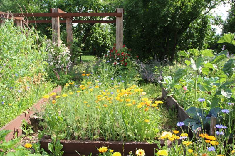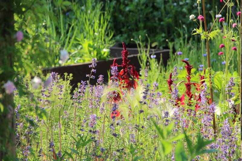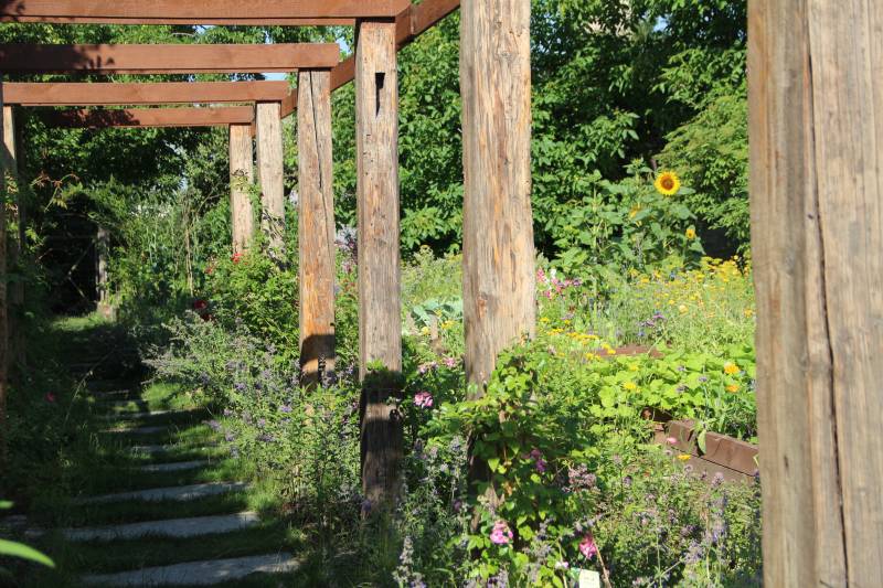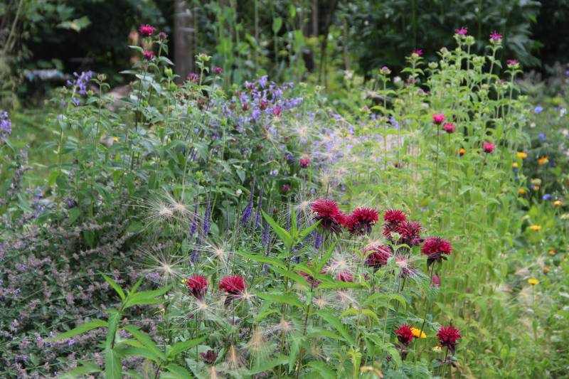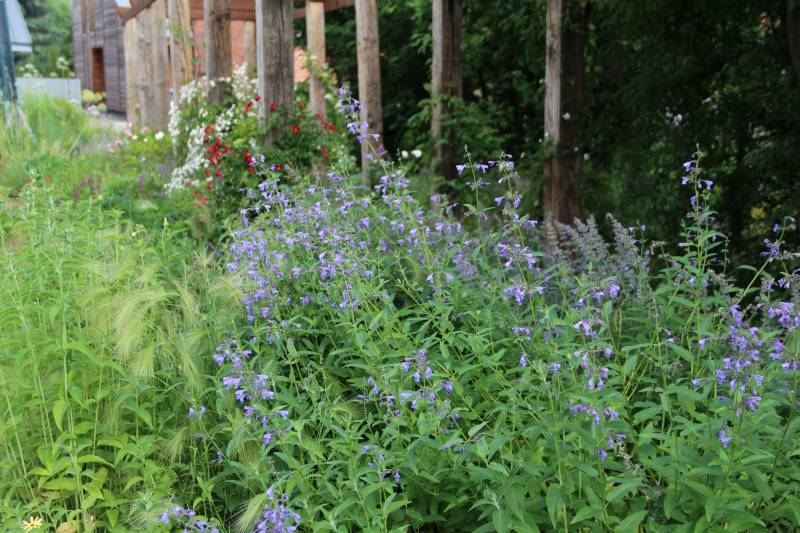 między pergolą a skrzyniami na warzywa jest szeroki na ponad metr pas z kwiatami. powstawał wiosną ubiegłego roku. kocimiętki rozmnożyłam z podziału jednej kępy. łubiny wysiałam. okazuje się, że wszystkie są w odcieniach fioletu. piwonie dostalam, ale nie kwitły w tym roku, więc nadal skrywają swą tajemnicę