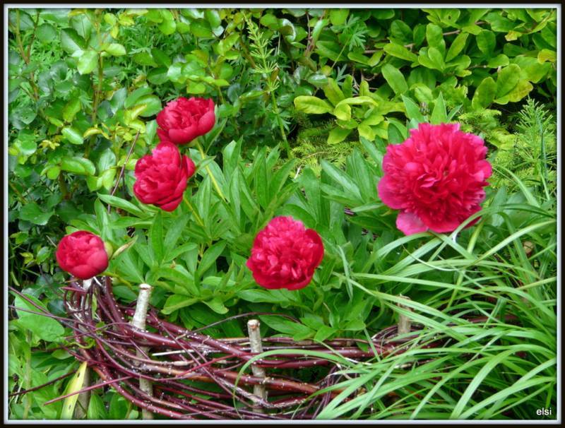 Edytka, teraz piwonie podrosły, zmieniły się proporcje i czerwone pędy derenia już tak nie rażą.