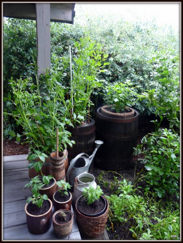 Miłko podwiązałam dalie w beczkach. To zachodnia strona, więc słońce dopiero po południu.