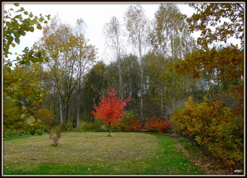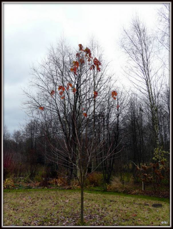 Wiatr zerwał te wcześniejsze kolorowe liście, teraz czerwienieją te na czubkach gałęzi.