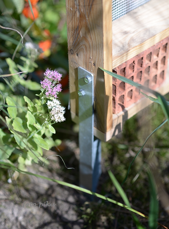 złotooków to skrzynka o dziurkowanych ściankach, wypełniona suchym materiałem (np. liśćmi, słomą lub mchem). Ulubionym kolorem złotooków jest czerwony, warto więc pomalować wlot w tym właśnie kolorze. Pamiętajmy jednak, że domek dla złotooków powinien być umieszczony na wysokości co najmniej 1,5 m w ciepłym, zacisznym i dość słonecznym miejscu. Z tego względu nie dokładałam tej kwatery do owadziego hotelu, który planowałam posadowić niżej. Dodatkowo zaleca się, przed znacznymi spadkami temperatur przenieść taki domek do pomieszczenia. W moim domu często widywałam zimujące złotooki na poddaszu. Niestety,po zagospodarowaniu tej części domu na użytkową, owady straciły swój hotel
