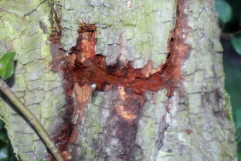 W zeszłym roku wyraźne zapachowe znaki przyciągające szerszenie i inne owady znaleźliśmy na naszym starym dębie, a u córki na dużo młodszym dębie. Przekonani że to jest coś innego zięć za zgodą urzędu wyciął dęba i okazało się, że to nasza trociniarka mocno go podziurawiła.
