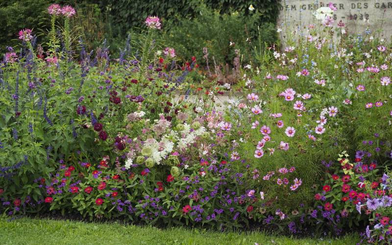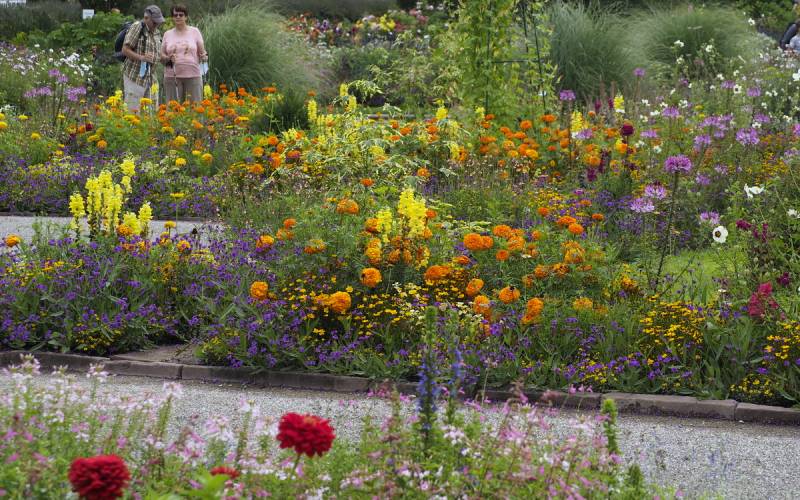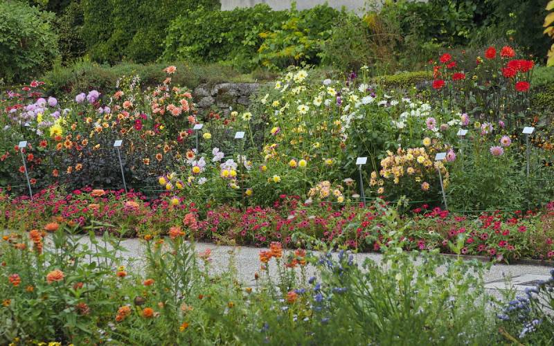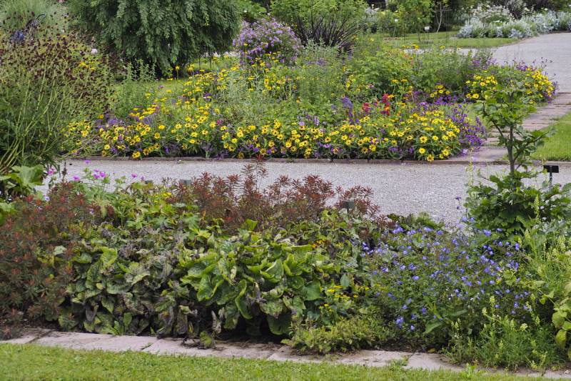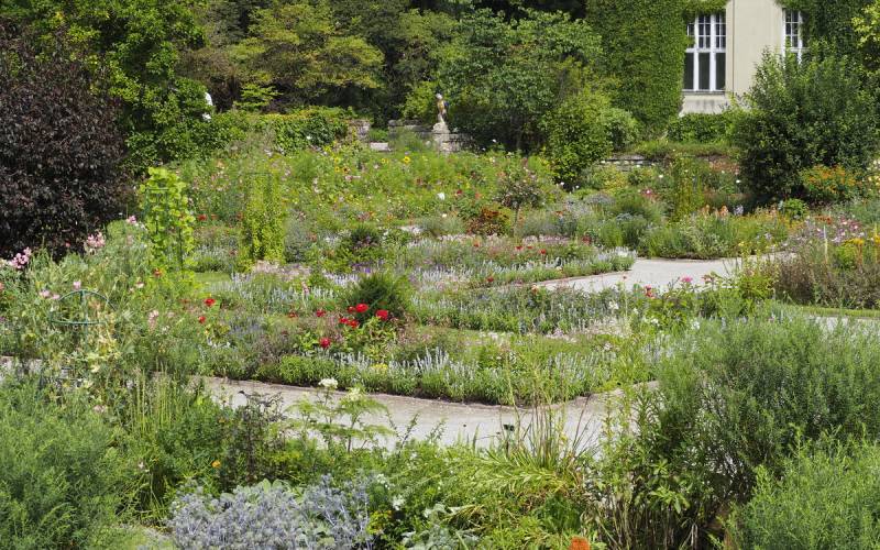 w układzie kwater sąsiadujących z budynkami ogrodu. Są one obsadzone bylinami oraz kwitnącymi roślinami jednorocznymi.