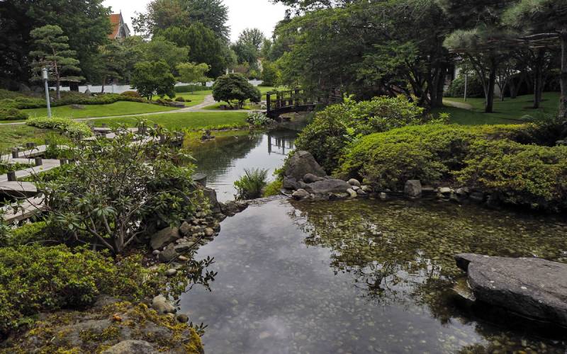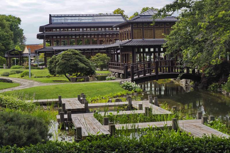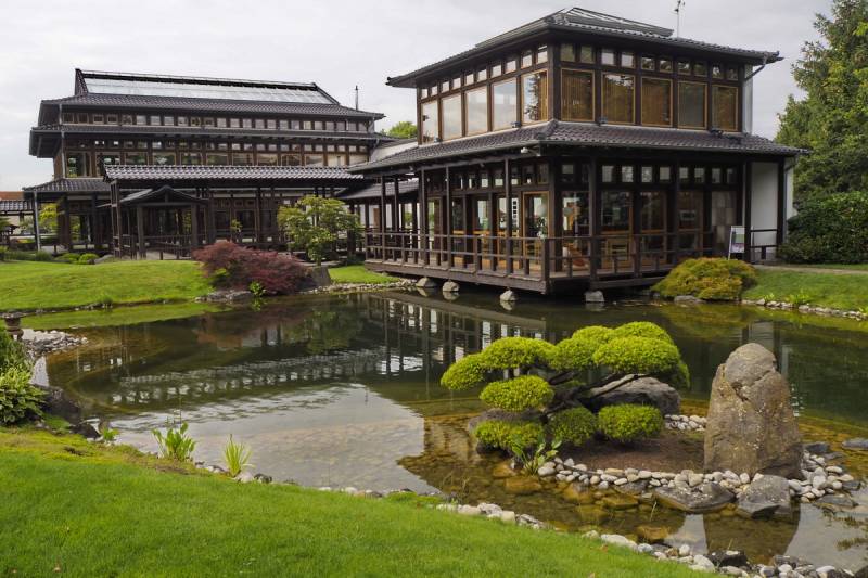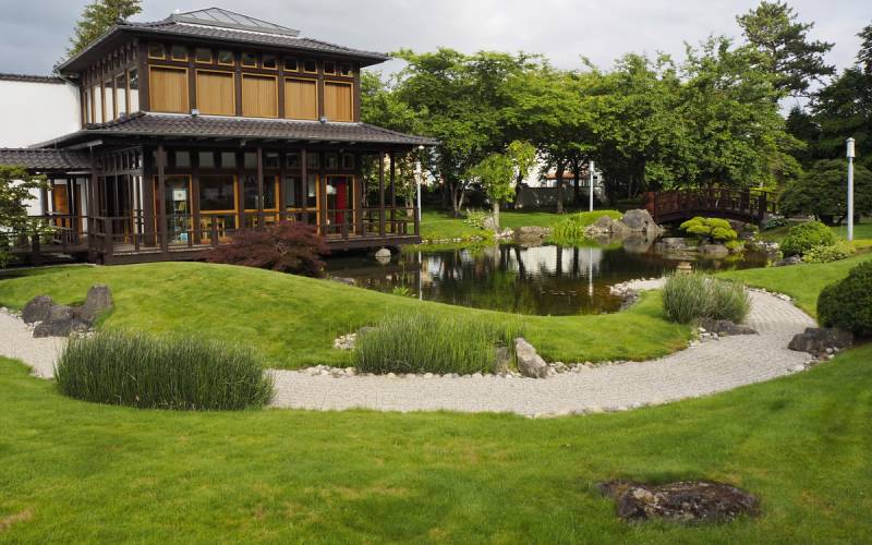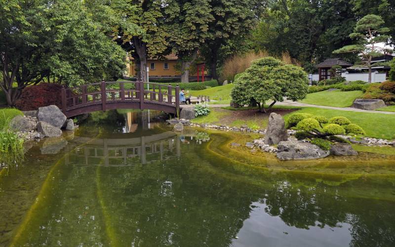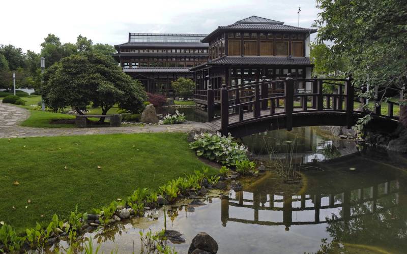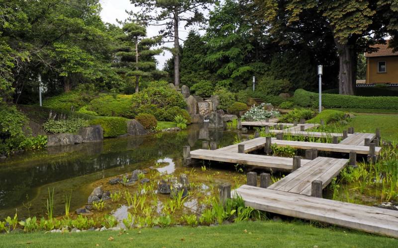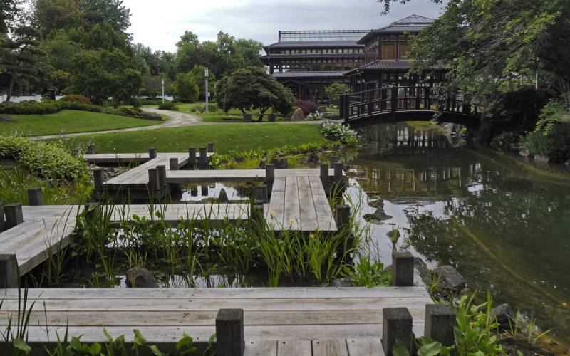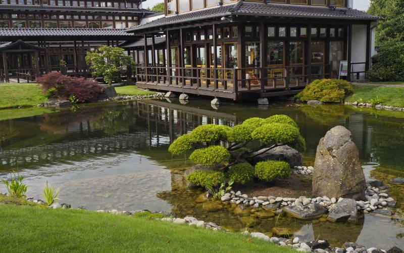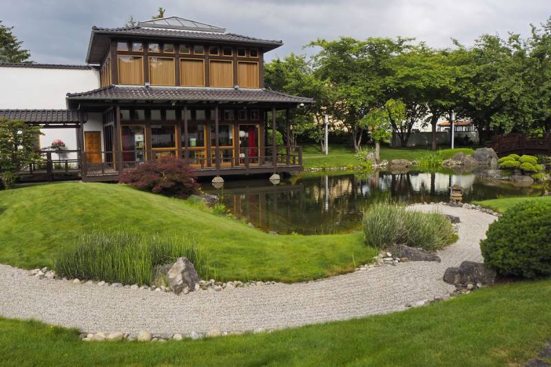 Najbardziej imponującymi elementami w ogrodzie, przyciągającym wzrok już od wejścia, są dwa połączone pawilony, skomponowane ze sporych rozmiarów stawem.