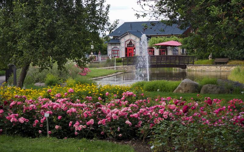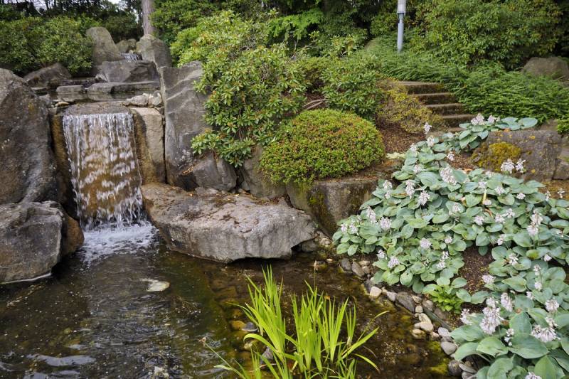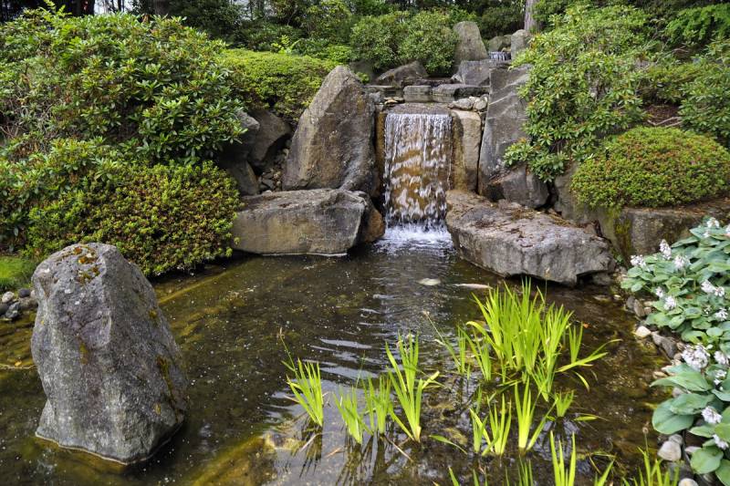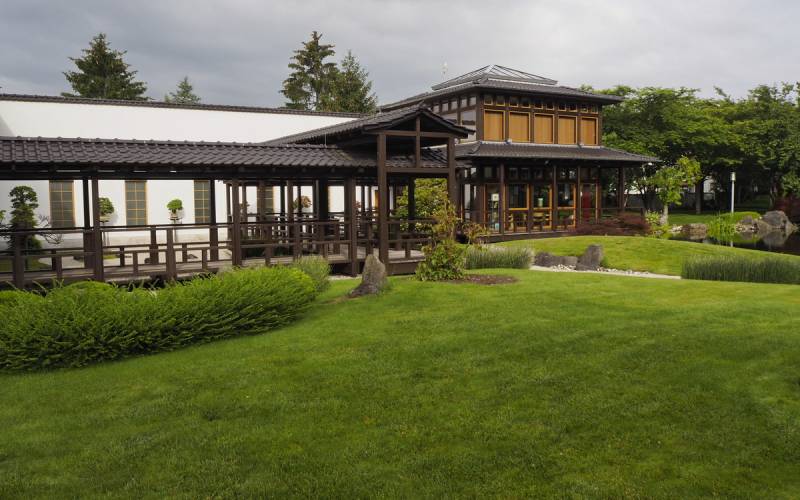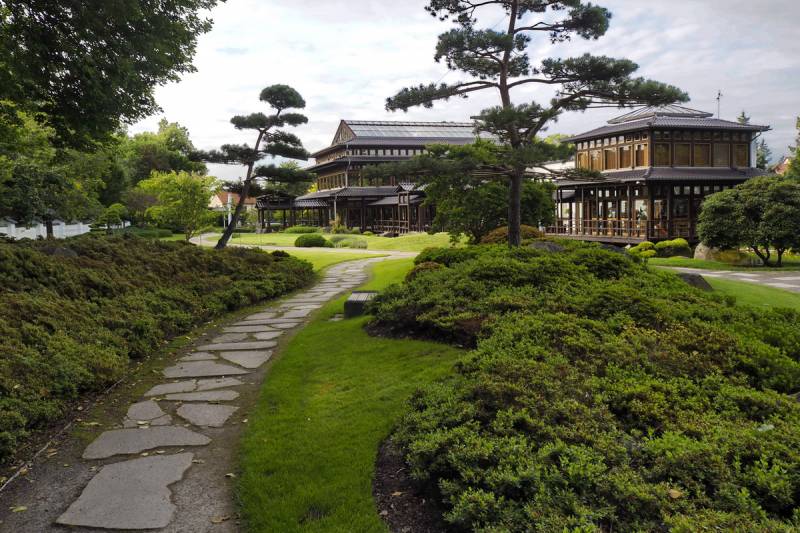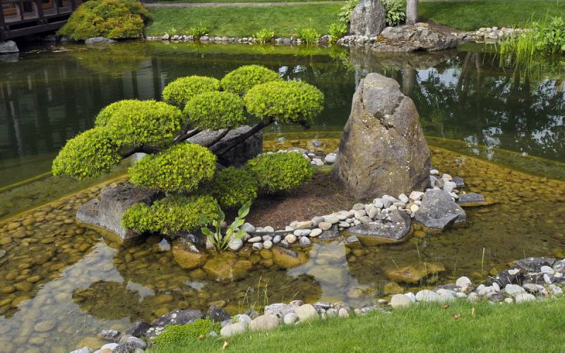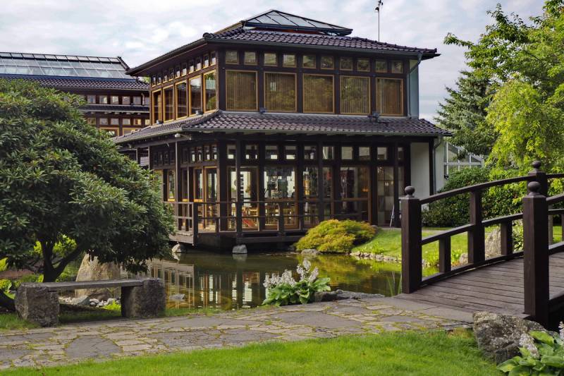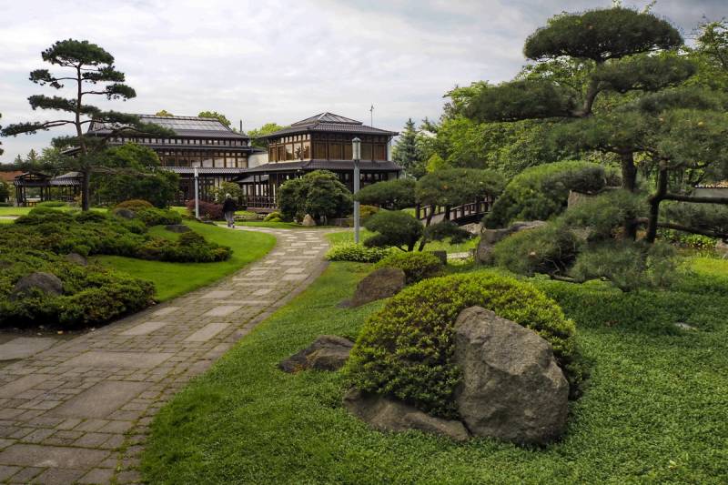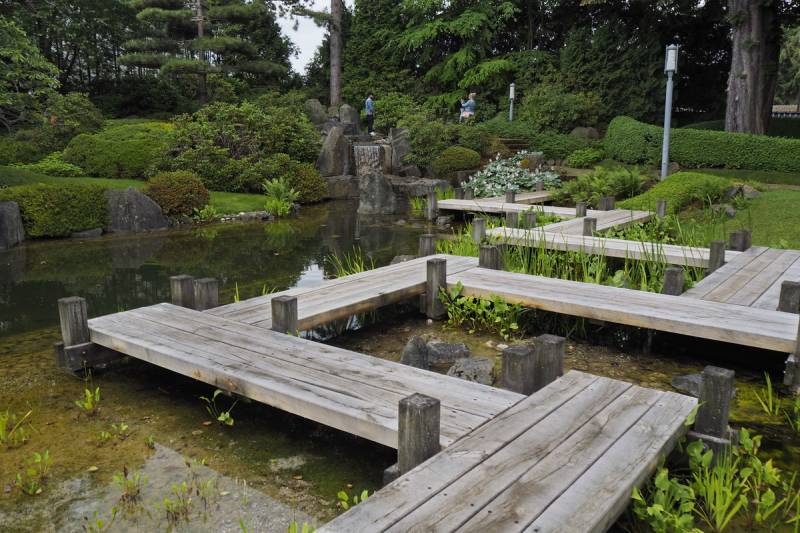 Najbardziej imponującymi elementami w ogrodzie, przyciągającym wzrok już od wejścia, są dwa połączone pawilony, skomponowane ze sporych rozmiarów stawem.
