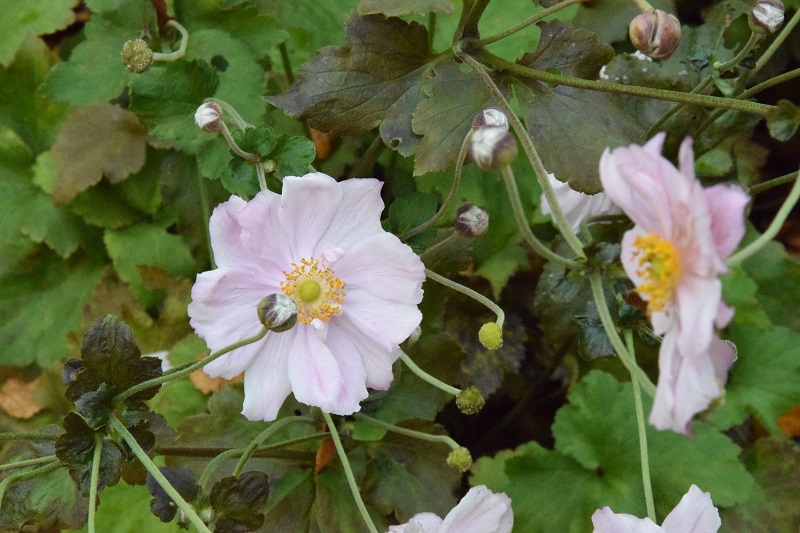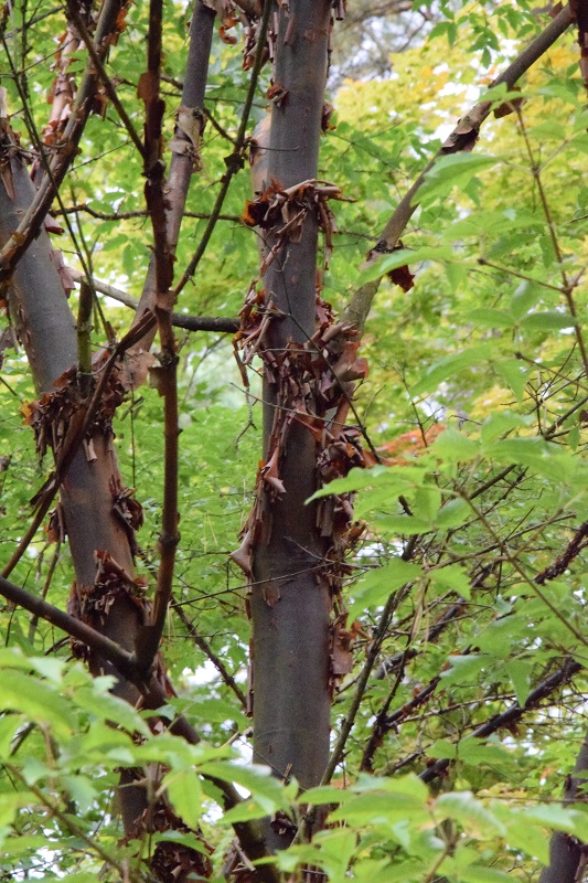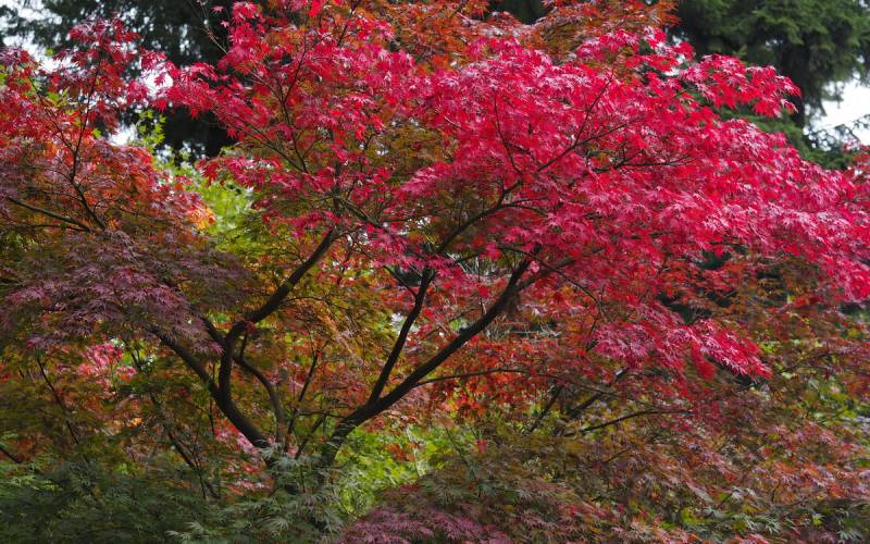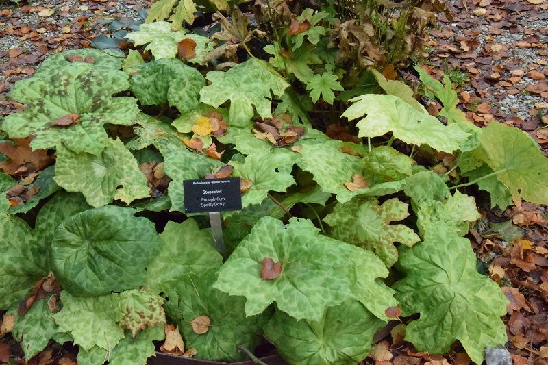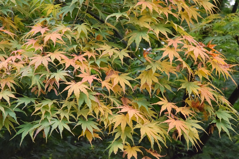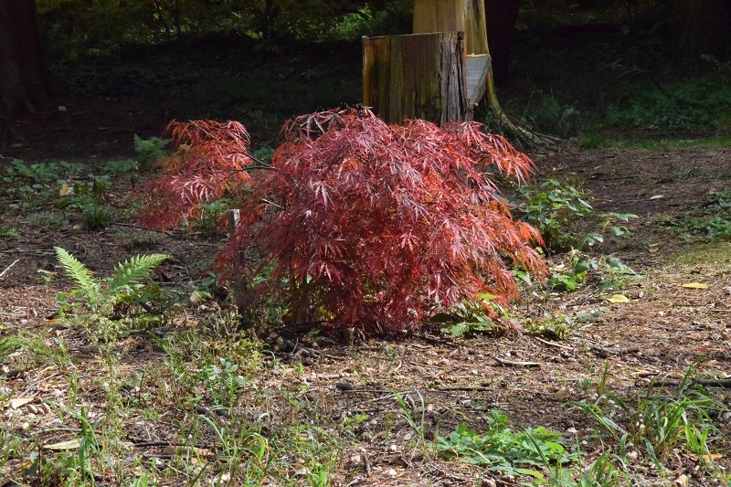 Ta sterta liści za roślinami oznaczonymi tabliczkami to klon japoński, pokrój wybitnie "poduszkowy"