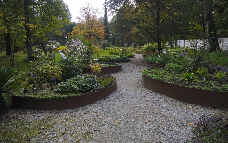 Zmierzamy w strone alpinarium nową ścieżką biegnącą pomiędzy podniesionymi rabatami z obrzeżami ze stali cortenowskiej. Po prawej stronie konstrukcja z bali drewnianych, każdy bal z innego gatunku drzewa, co zostało opisane.