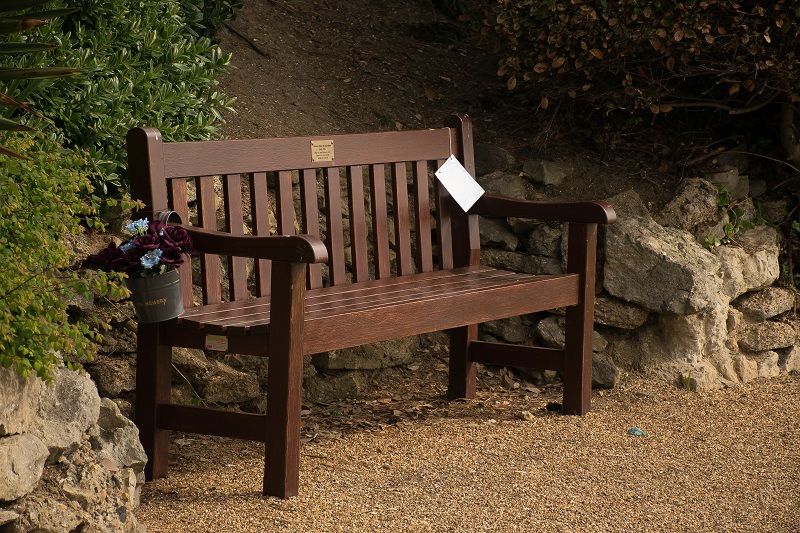Ławeczki tutejszym zwyczajem poświęcone konkretnym osobom, ta np. ufundowana przez rodzinę dla zmarłego dziadka. Była nawet kartka urodzinowa z życzeniami oraz bukiecik kwiatów. Czy u nas coś takiego uchowałoby się przed wandalami?