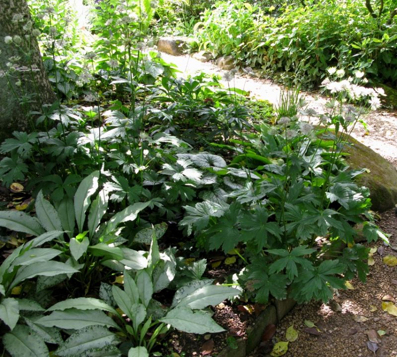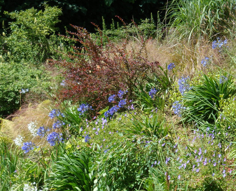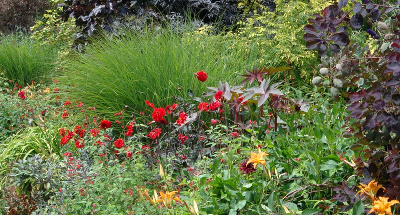 W tle koloru dodawały krzewy o ciemnych liściach perukowiec, czarny bez, klon, berberys,leszczyna. Na fioletowo kwitła budleja. Żeby ciemny kolor nie przytłaczał na rabacie miejsce znalazły też zielone trawy i paprocie.