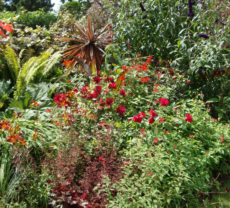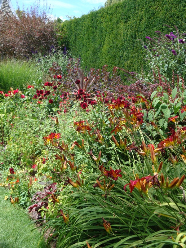 Byłam w Hidcote Manor pod koniec lipca. Największe wrażenie zrobiła na mnie Red Border -dwie długie rabaty przedzielone prostokątnym trawnikiem ,oparte o strzyżone żywopłoty. Kolory kwiatów to głównie różne odcienie czerwieni, pomarańcz . Najbardziej spektakularnie wyglądały dalie i liliowce.