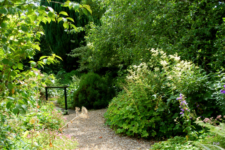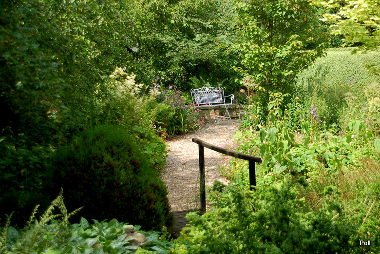 Woda przepływa w poprzek ogrodu, więc przechodzimy przez obrośnięty bylinami mostek...