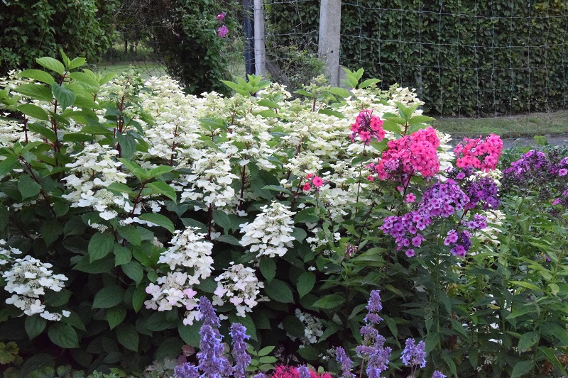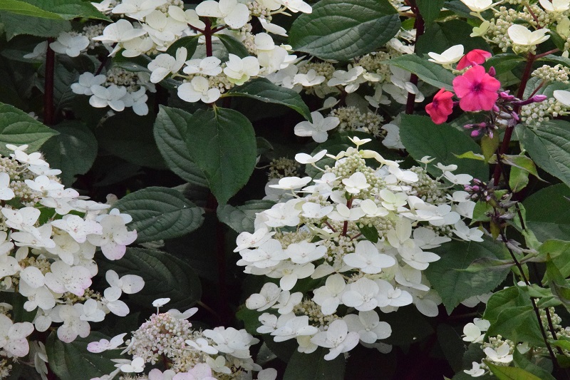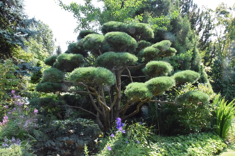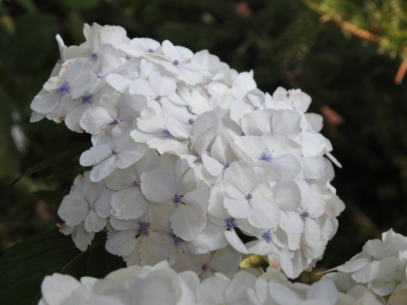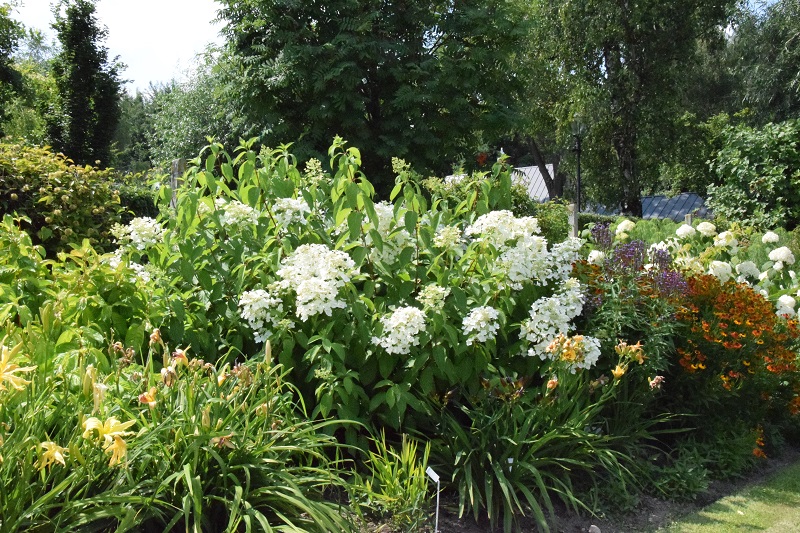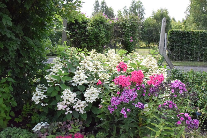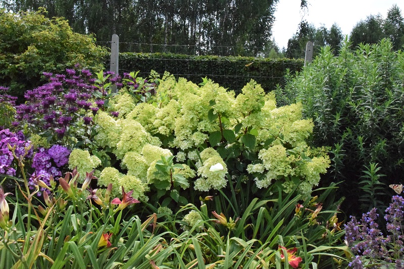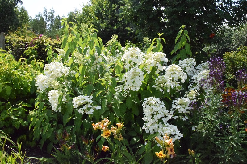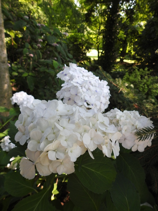na wietrze, poprzez oszalamiające wiechy hortensji wkomponowanych między krzewy i drzewa, zarówno iglaste, jak i liściaste...