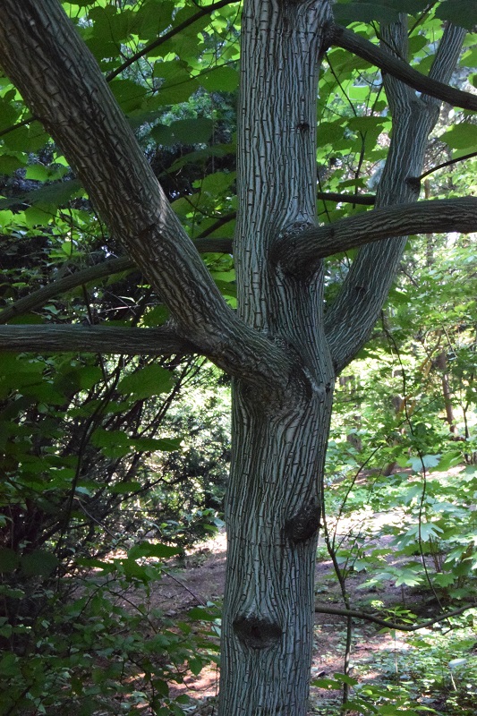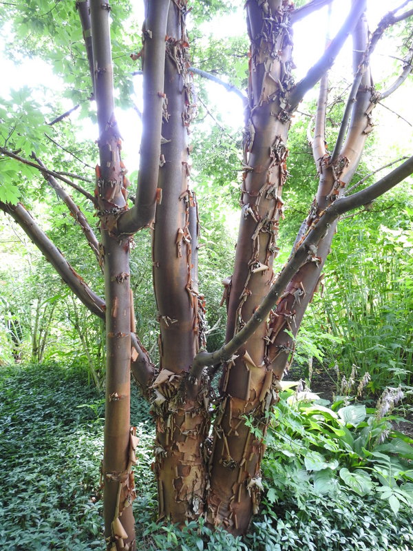 Wchodzimy do ogrodu. W części dość mocno zacienionej, piękna kora klona - acer tegmentosum 'Joe Wit'
