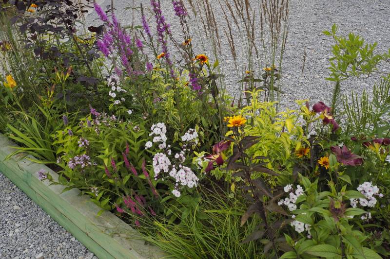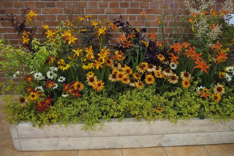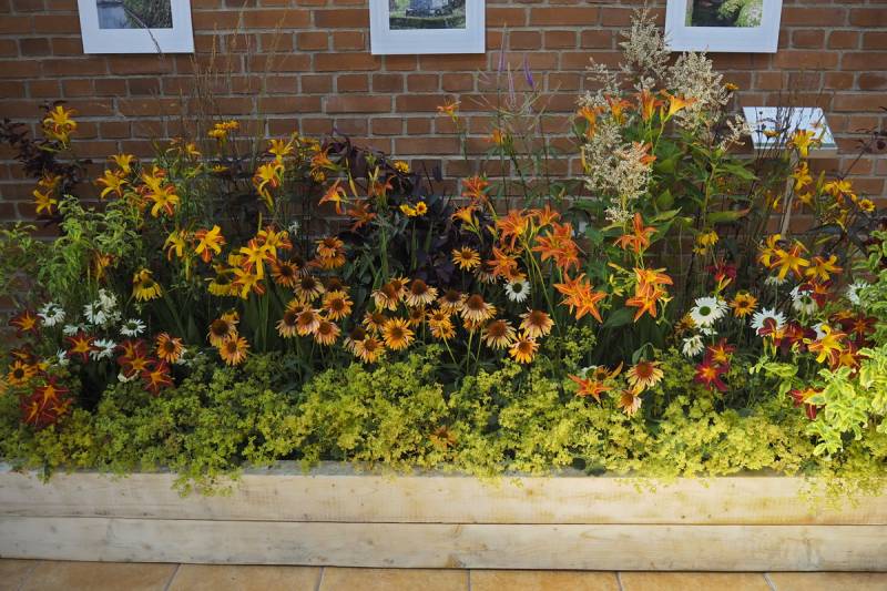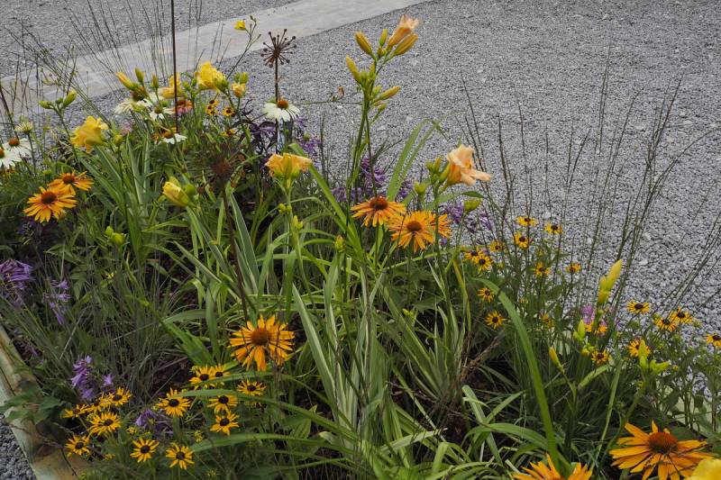 na zewnątrz przygotowano też przykłady aranżacji liliowców z innymi bylinami