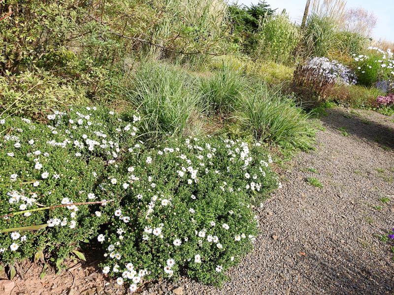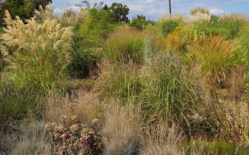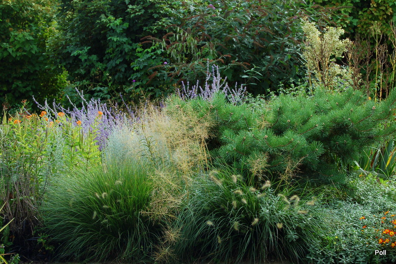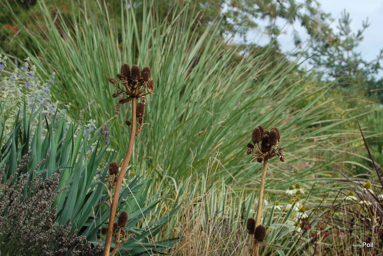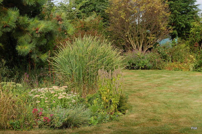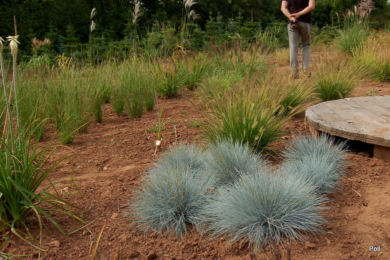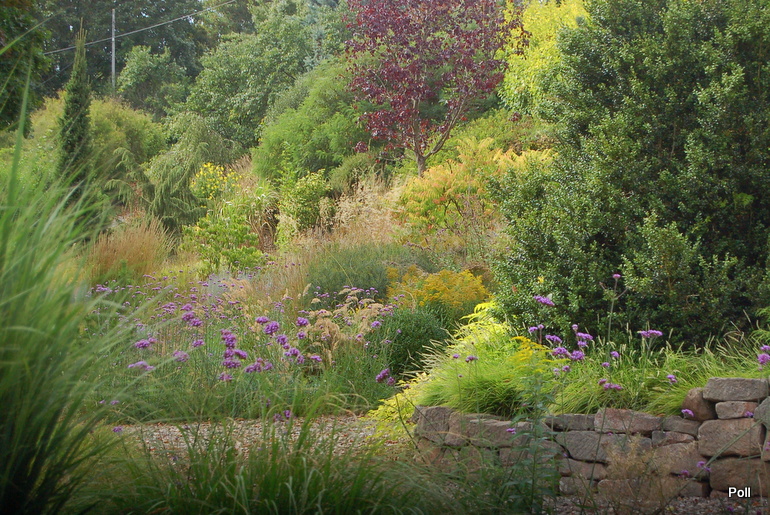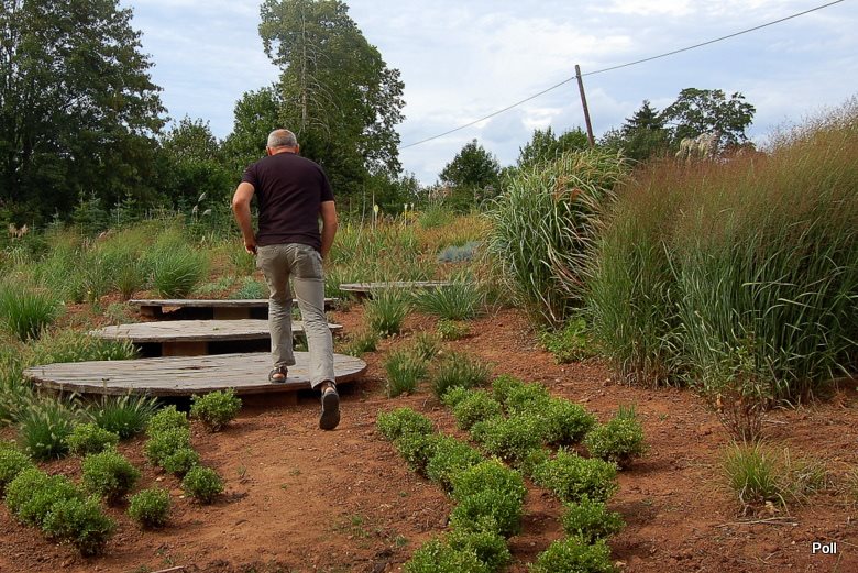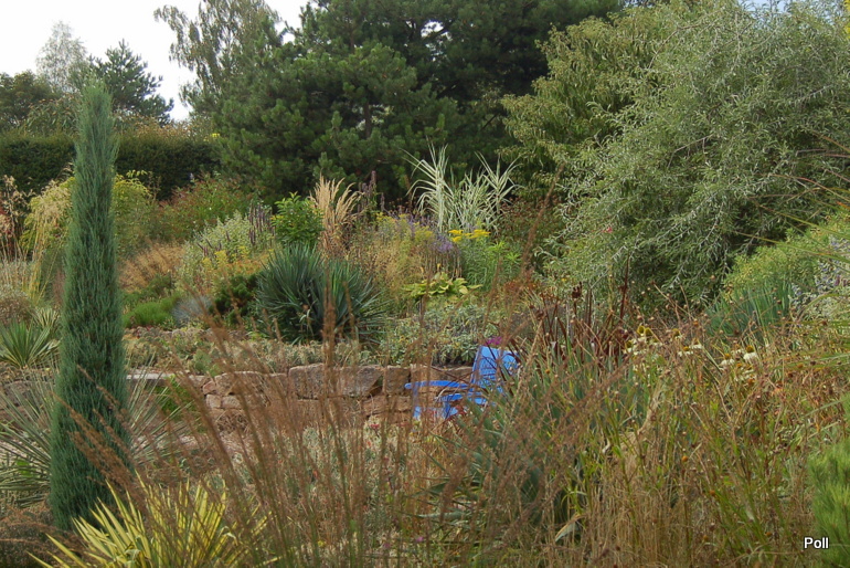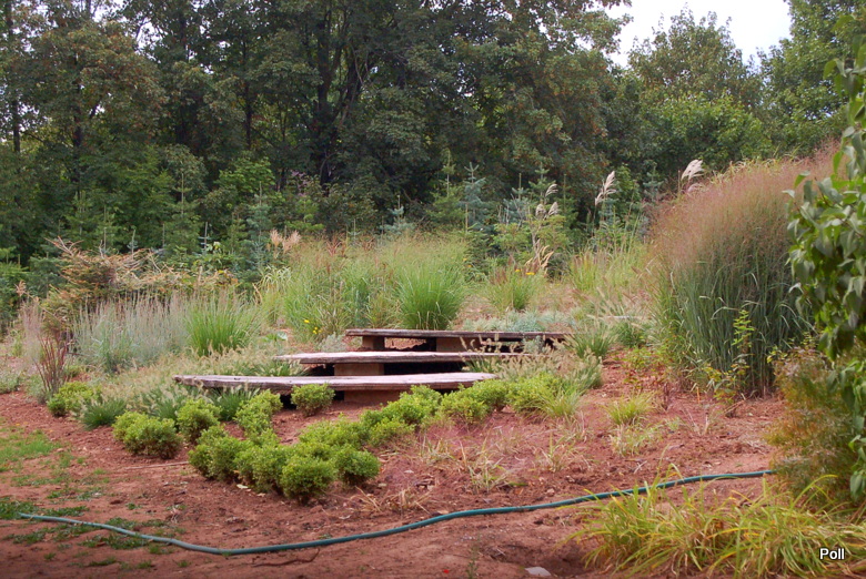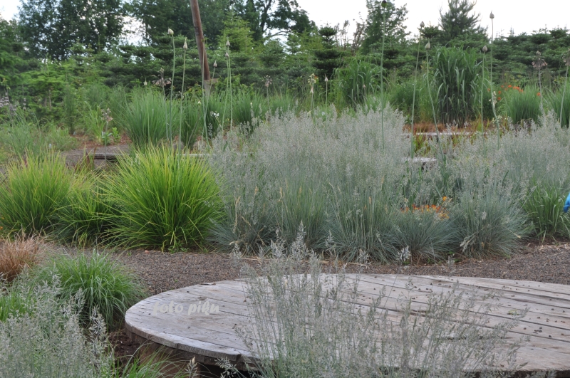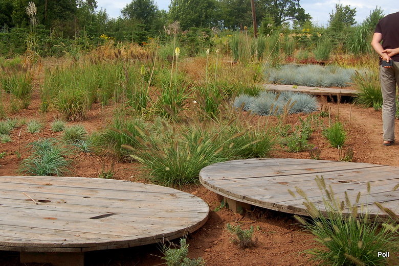 Ostatnio powstałym miejscem jest położona na słonecznym stoku rabata trawiasta, której nieco kosmicznego charakteru nadają podesty-ścieżki o kształcie koło. Był to kapitalny pomysł i gdy rośliny się rozrosną, będzie to jedna z najpiękniejszych rabat trawiastych, jakie widziałam. Wielkim plusem i ułatwieniem, jest brak konieczności skupienia się na ograniczonym terenie, bo miejsca jest jeszcze sporo , więc można to i owo dodać.