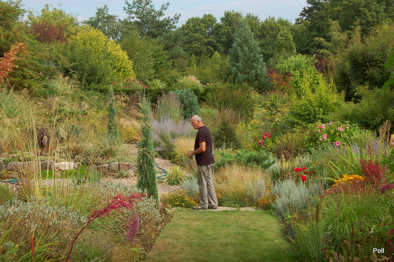 Wspaniale położony na stoku, z cudnym widokiem na majaczący w oddali Szczeliniec , ma tę przewagę nad innymi ogrodami, że teren 'współpracując z Kasią i Tomkiem, pozwolił na stworzenie niebanalnego miejsca. Jednoczesśnie, nie jest to teren łatwy, więc kształt ogrodu i poszczególnych pokoi, wymuszony jest niejako przez górskie warunki. Nie chciałabym też, aby ktoś pomyślał, iż jest to założenie na miarę Wojsławic.... Tak nie jest, bo ogród w Radkowie jest ogrodem wiele mniejszym i kameralnym, ale jednak wartym odwiedzenia.