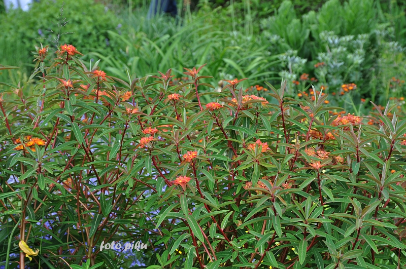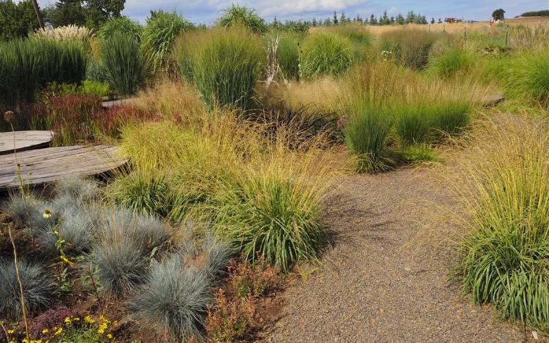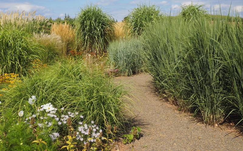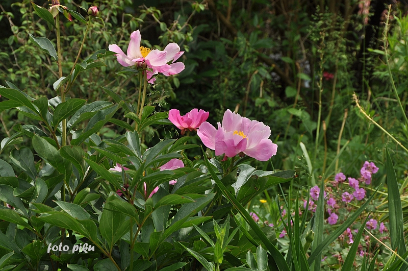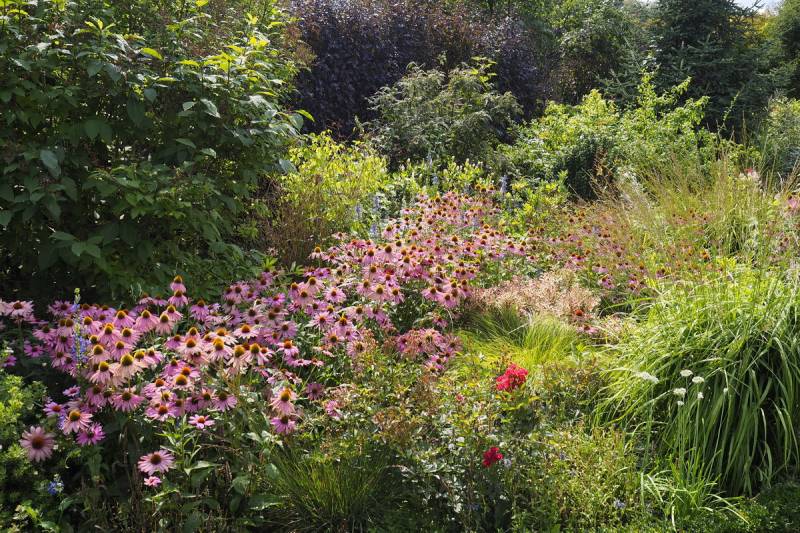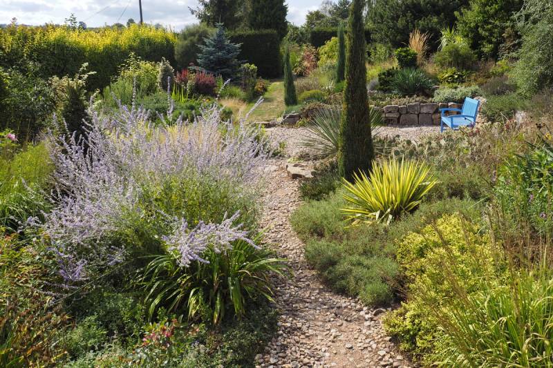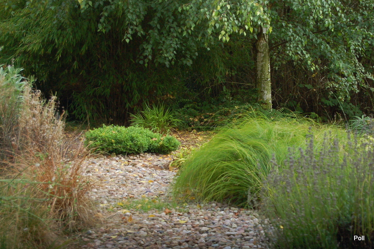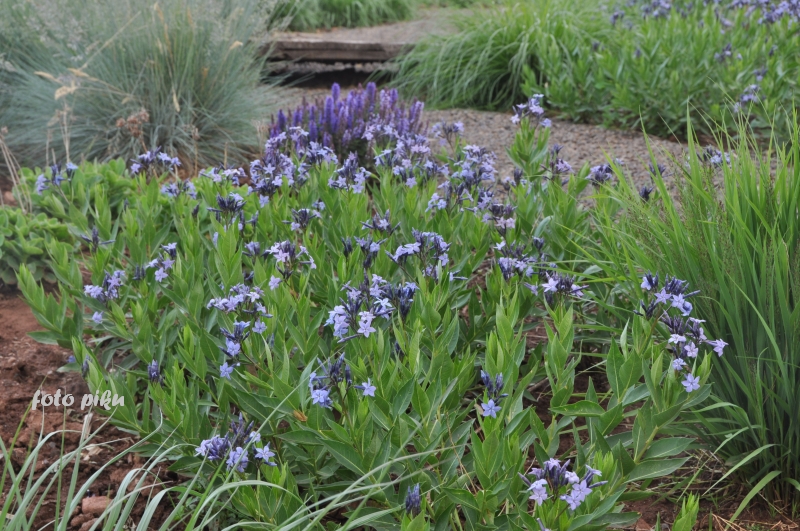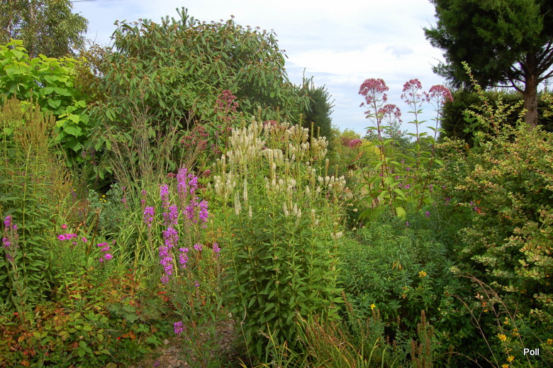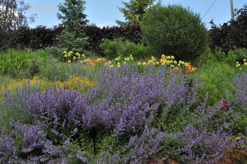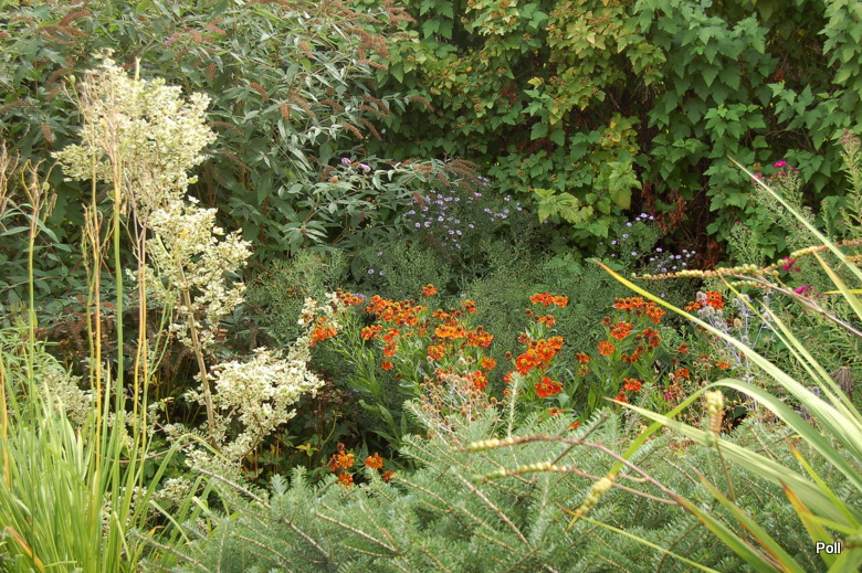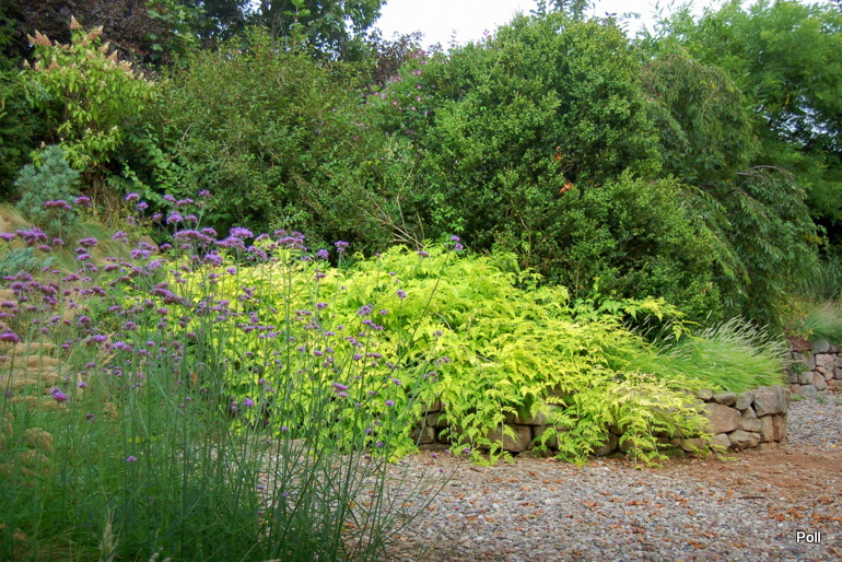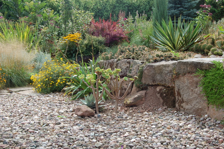 Tymczasem, znaleźliśmy się w pokoju preriowym...Na lewo od ściezki podniesiono nieco skarpę tworząc prostokątny placyk, wokół którego zbudowany jest kilkuwarstwowy murek z prostokątnych kamieni. To właśnie miejsce skupia wiele gatunków i odmian roślin, które kojarza się nam z typową prerią. Własciciele podkreslili ten charakter ściółkując glebę nieregularnym żwirem