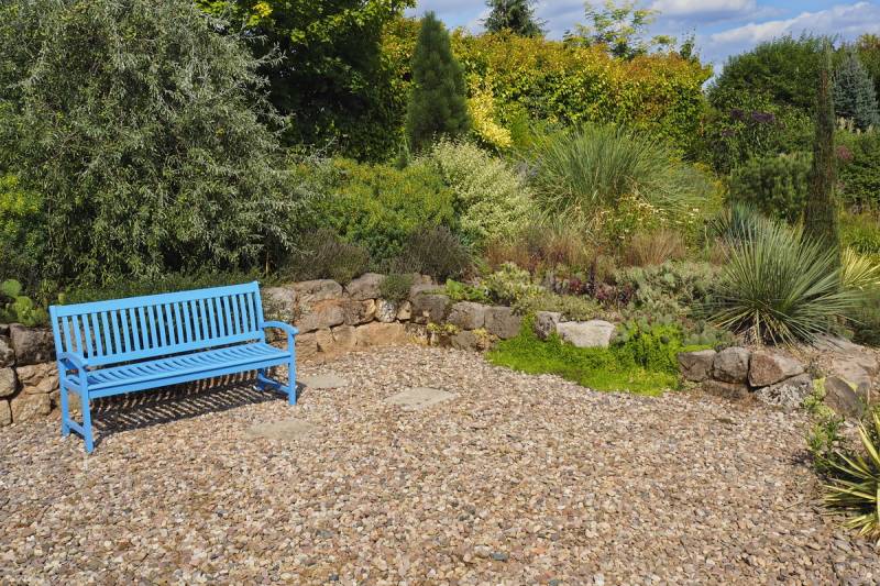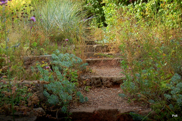 W centrum, pod murem ustawiona jest ławka, na której możemy usiąść, by w spokoju oglądać zgromadzone tu rośliny i podziwiać sposób ich nasadzeń, bowiem oprócz roślin wyeksponowanych na podniesionej skarpie, wypatrzeć mozna sporo dość pospolitych gatunków, których siła polega nie na urodzie a sposobie rozrastania się. Wetknięte w szczeliny muru spływają w dół, lub tworzą coraz to większe kolonie , wchodząc niemal jedne na drugie.
