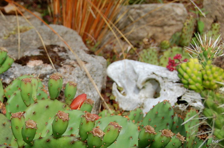 ...a także ...czaszką zwierzęcia, która natychmiast nasunęła mi obrazy z westernów oglądanych za dawnych lat. Pobielała, leży pomiędzy opuncjami, które powoli ją zarastają. Lepszego symbolu charakteru tej części ogrodu nie można było wybrać!