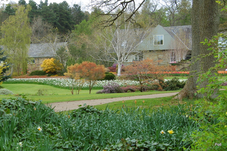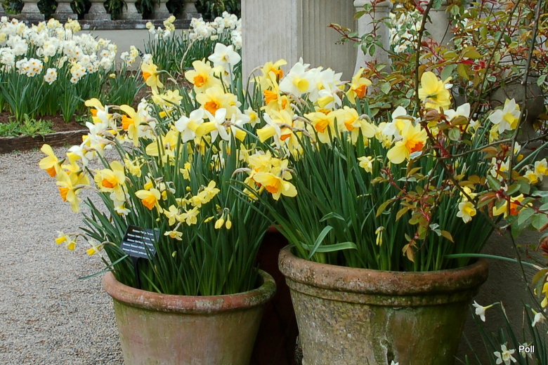 Przy wejściu głownym do ogrodu wita nas widok na kwitnące rabaty kwiatów cebulowych i oczywiście zapełnione donice