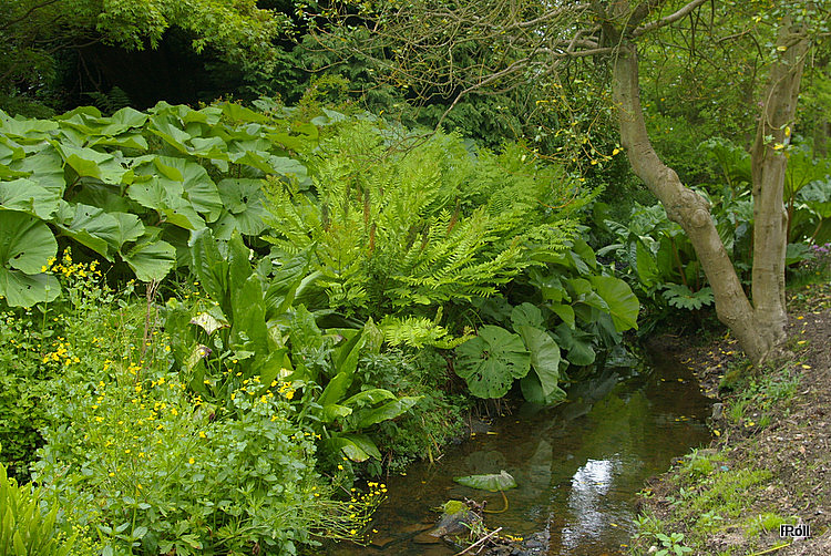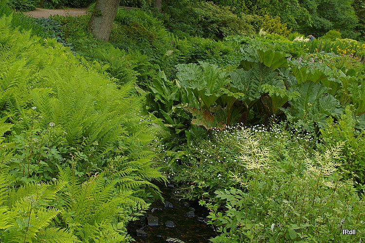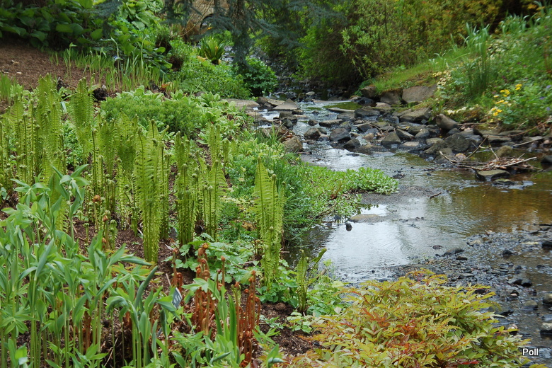 Streamside, to prawdziwy raj dla wielbicieli gęstych, mocnych i głownie cienistych nasadzeń. Gatunki i odmiany roślin przenikają się mocnymi plamami tawułek, astilbloidesów, host, paproci, prymul kandelabrowych...Choć wydaje się, iz nasadzenia są nieco chaotyczne, nie jest to prawdą - sa starannie przemyślane pod katem wymagań roślin - te, które potrzebują dużo wilgoci posadzone zostały niemal w korycie strumienia a te, które wymagają jej mniej, znajdują sie w szczytowych partiach skarpy, niemal na poziomie rabat bylinowych.