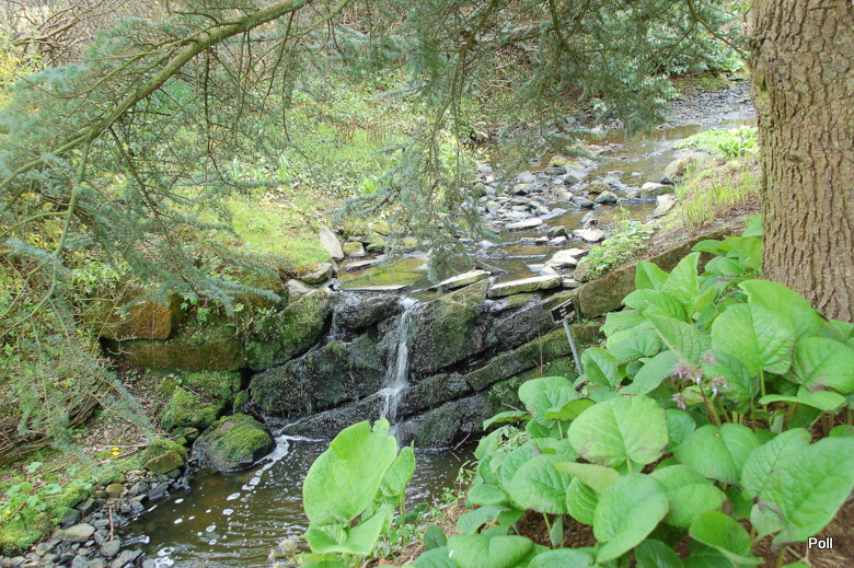 Mijając kolejne mostki nad potokiem, możemy podziwiać również nasadzenia na wzniesionych rabatach po przeciwnej stronie alejki. Sa one jakby kontynuacją nasadzeń nadwodnych, ale możemy tam zobaczyć rośliny, które nie wymagają stale dużej ilości wilgoci. Tak więc po jednej stronie potok i mostki...
