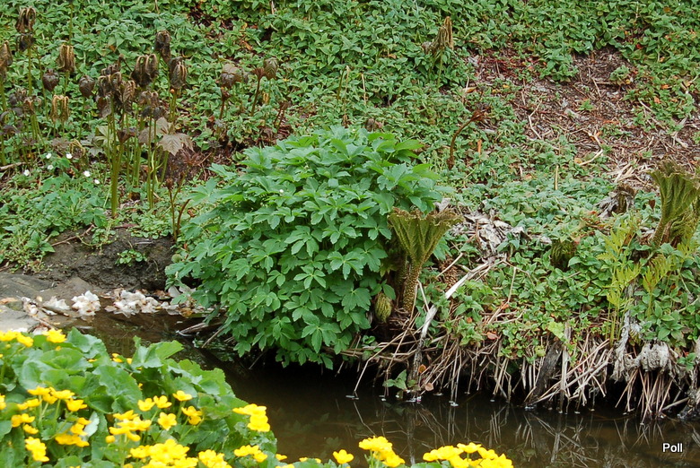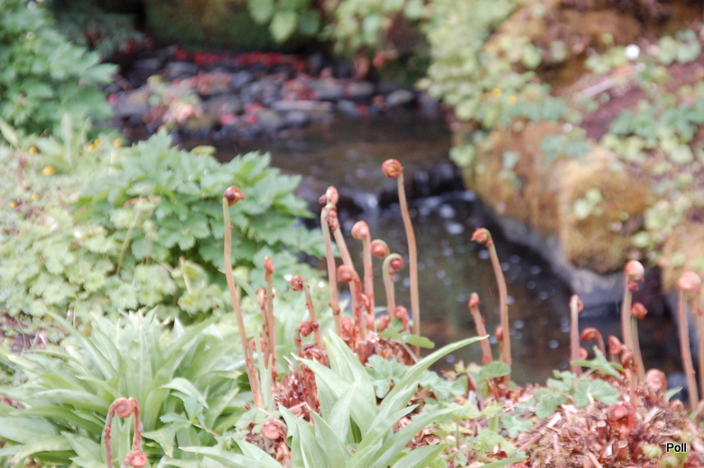 Choć strefa przy strumyku nie jest juz zupełnie pusta, to jednak dużo brakuje jej do czerwcowego przepychu! W maju królują tu tulejniki amerykańskie i kamczckie, pastorały paproci, zdrojówki rutewkowate i powoli rozwijajace sie gunery.