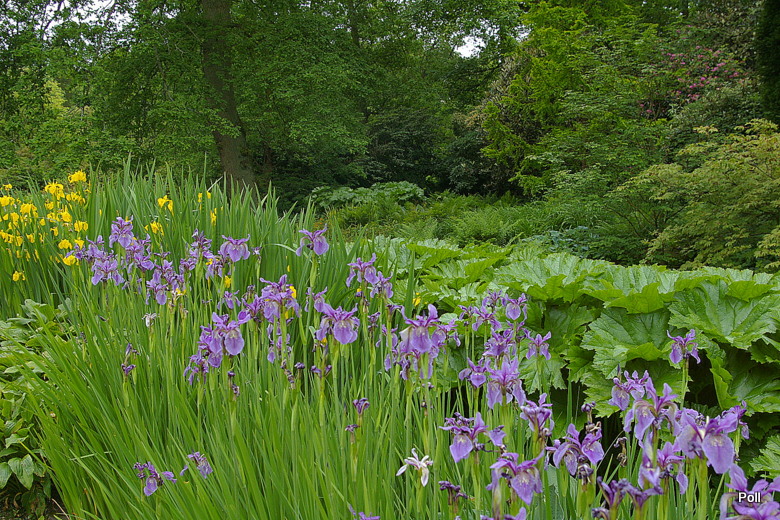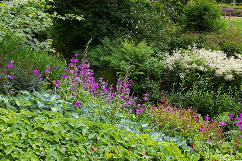 Czerwiec, to najpiękniejszy okres dla host. W Harlow Carr nie ma ich zbyt dużo odmian, ale tam, gdzie są, wspaniale komponują się z resztą ogrodu. Ponieważ ogród prowadzony jest naturalnie, nie stosuje się tutaj chemicznych środków przeciw ślimakom. Bliskość wody powoduje więc, że już w licu mają one już poważnie uszkodzone liście, co nie wygląda zbyt zachęcająco.