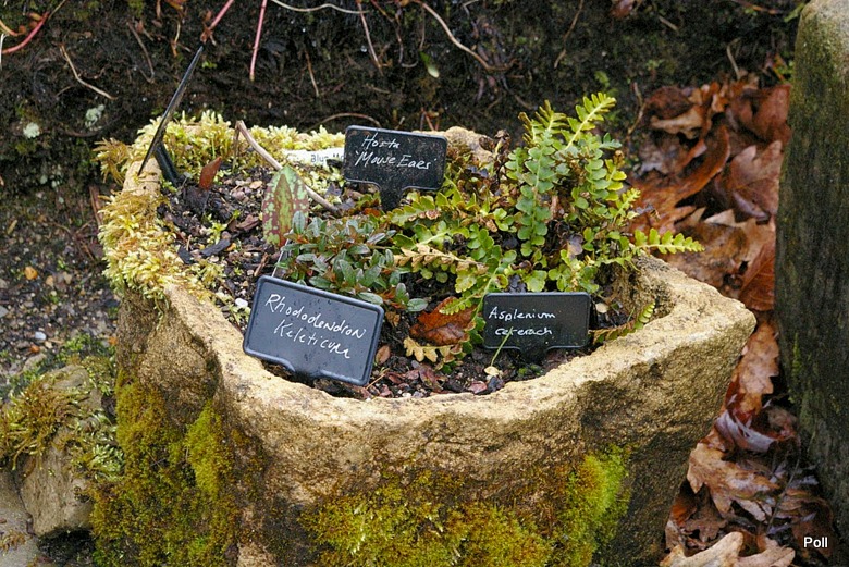 U podnóża stoku, jako inspiracje do małych ogrodów, ustawiono oryginalne donice, w których umieszczone zostały roślinne maluszki - w tej akurat znana nam wszystkim hosta Blue Mouse Ears, Rhododendron kaleticum i śledzionka skalna (Ceterach officinarum)