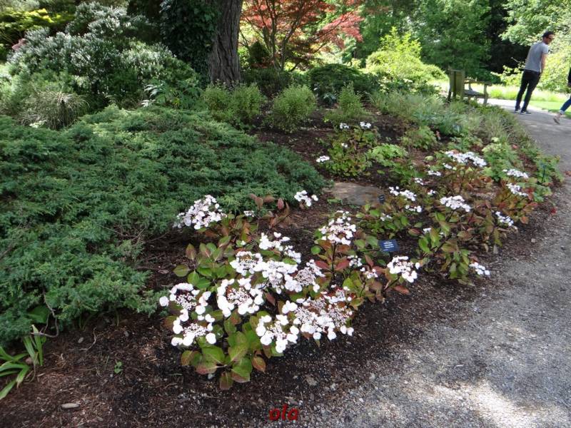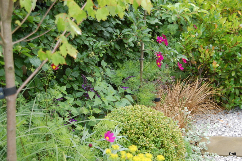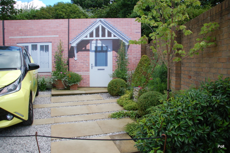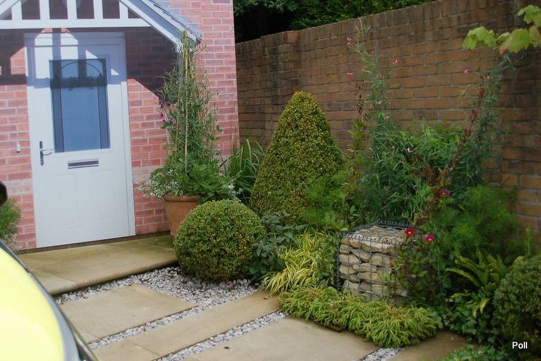 Taka właśnie nieduża hybryda(opatrzona w logo RHS), stoi w centralnym punkcie przykładowego przedogródka, który pokazuje, iz mimo niewielkiej ilości miejsca, może być zielono i roślinnie