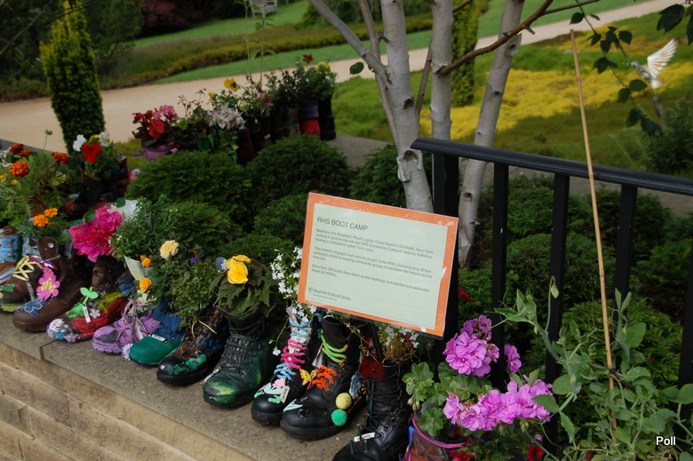 Ten problem jest coraz częściej podnoszony w prasie, czy telewizji. Bije się na alarm, ze Anglia staje się szarym, wybetonowanym krajem. Stąd sporo inicjatyw, m.in. RHS (Królewskie Towarzystwo Ogrodnicze), które mają ponownie obudzić ogrodniczego ducha w narodzie angielskim. Podczas mojej ostatniej wizyty w ogrodzie Harlow Carr ( zapewne i Olusi też ) , trwała akcja RHS pod tytułem 'Zazieleńmy szarą Brytanię'. Prowadzono pogadanki, wydano ulotki i plakaty, ale nie tylko... By zwrócić uwagę na problem w jakiś nietuzinkowy sposób, z pomocą 6 Regimentu Królewskiego Korpusu Logistycznego , który współpracuje z RHS CO w Yorkshire, zorganizowano dla uczniów tutejszych szkół 'Boot camp'.